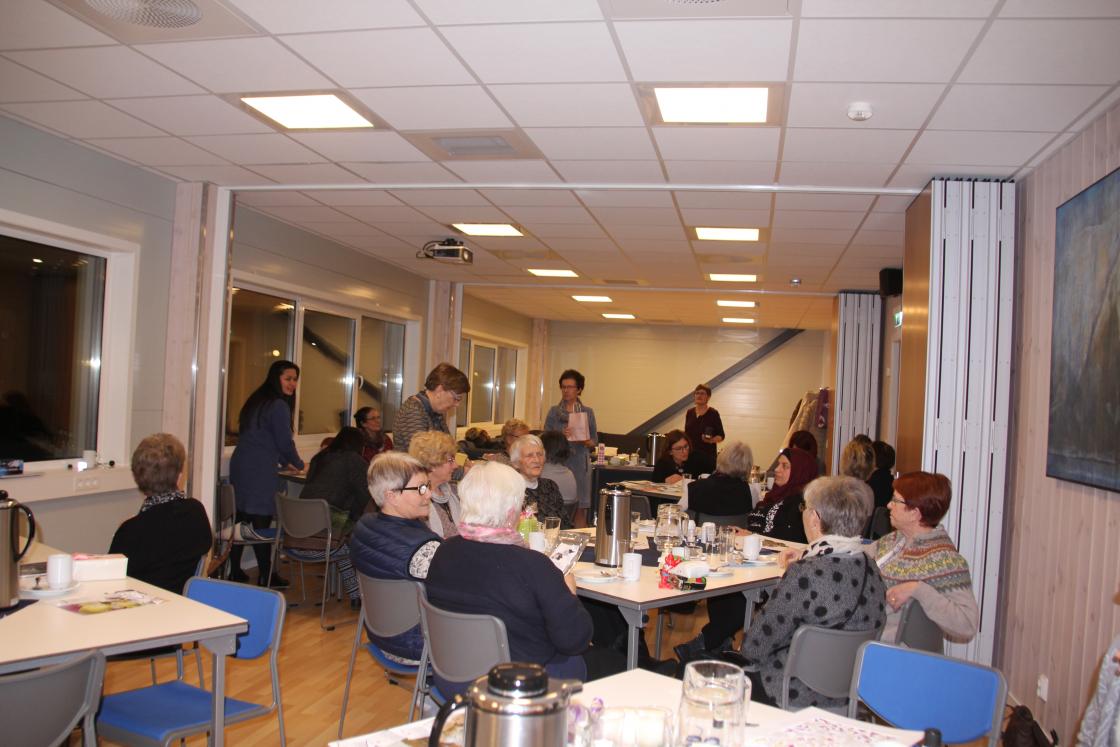34 damer møtte til samkome i Fjordahallen den 12. februar. Me hadde bede inn tilflyttarkvinner frå ulike land denne kvelden. Eit godt førearbeid med invitasjon i postkassar og direkte kontakt via flyktningekonsulenten , gjorde at mange fann vegen til bygdekvinnelaget sitt møte. Etter at leiaren hadde ynskt velkomen og fortalt litt om laget, var det matøkt. Og sidan me hadde bede inn gjester, spanderte me på oss varmrett. Det var god kyllinggryte med ris og salat, levert frå Ullensvang Gjesteheim.