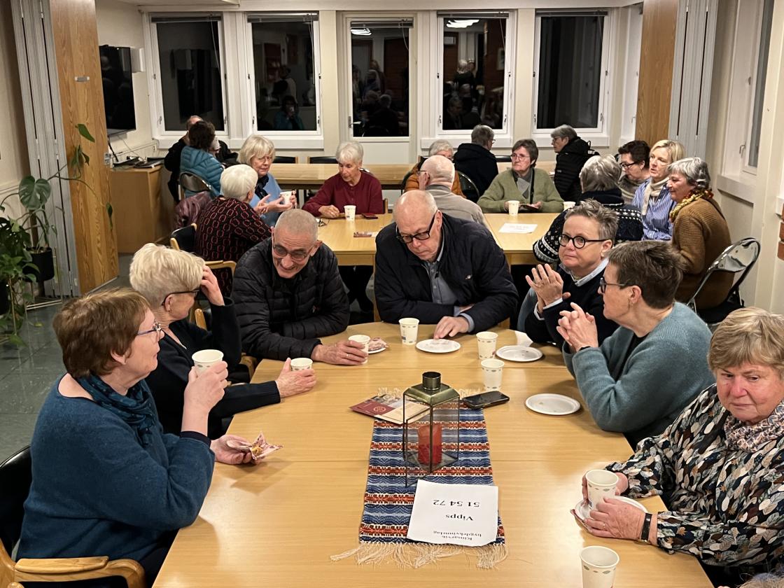 Folk sette pris på servering i pausen. Det var god prat, og dei kjøpte mykje lodd.