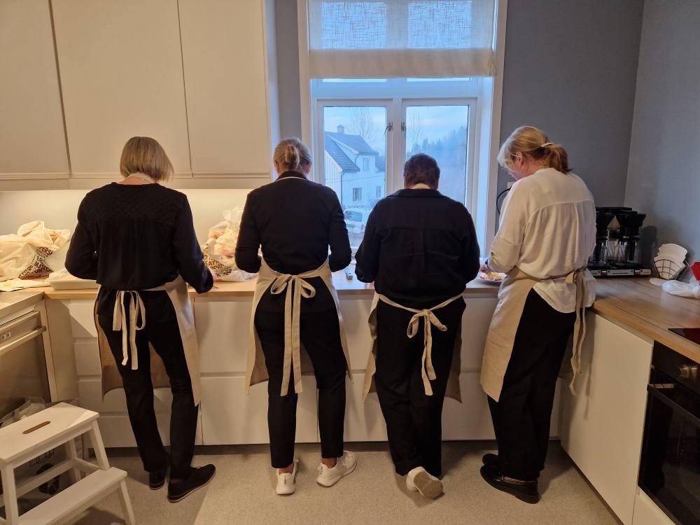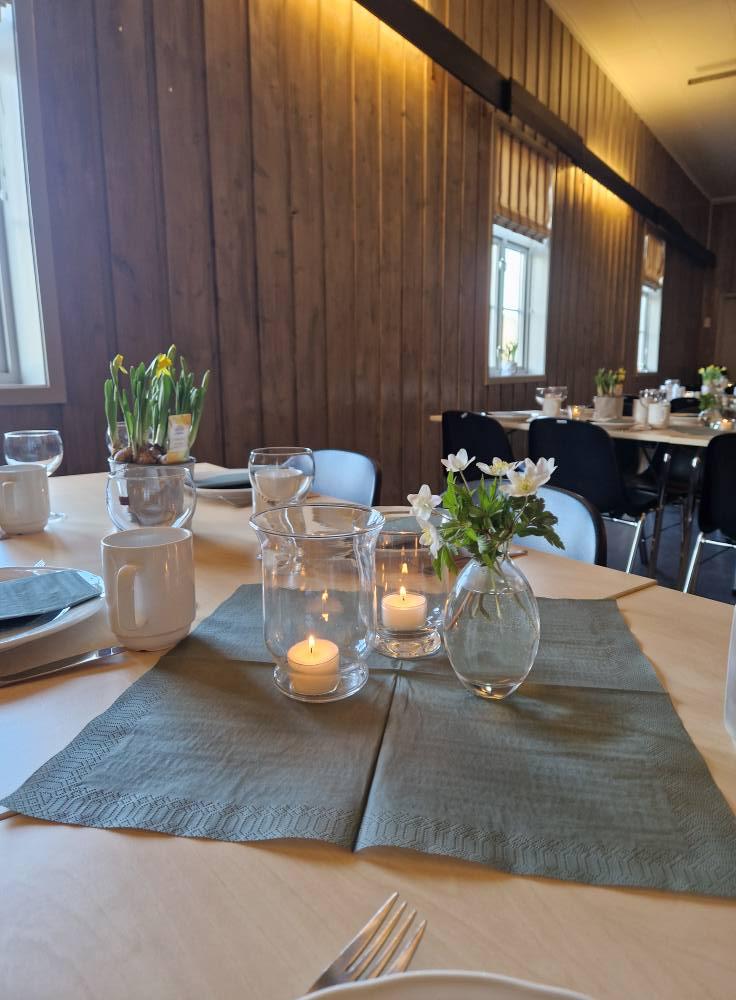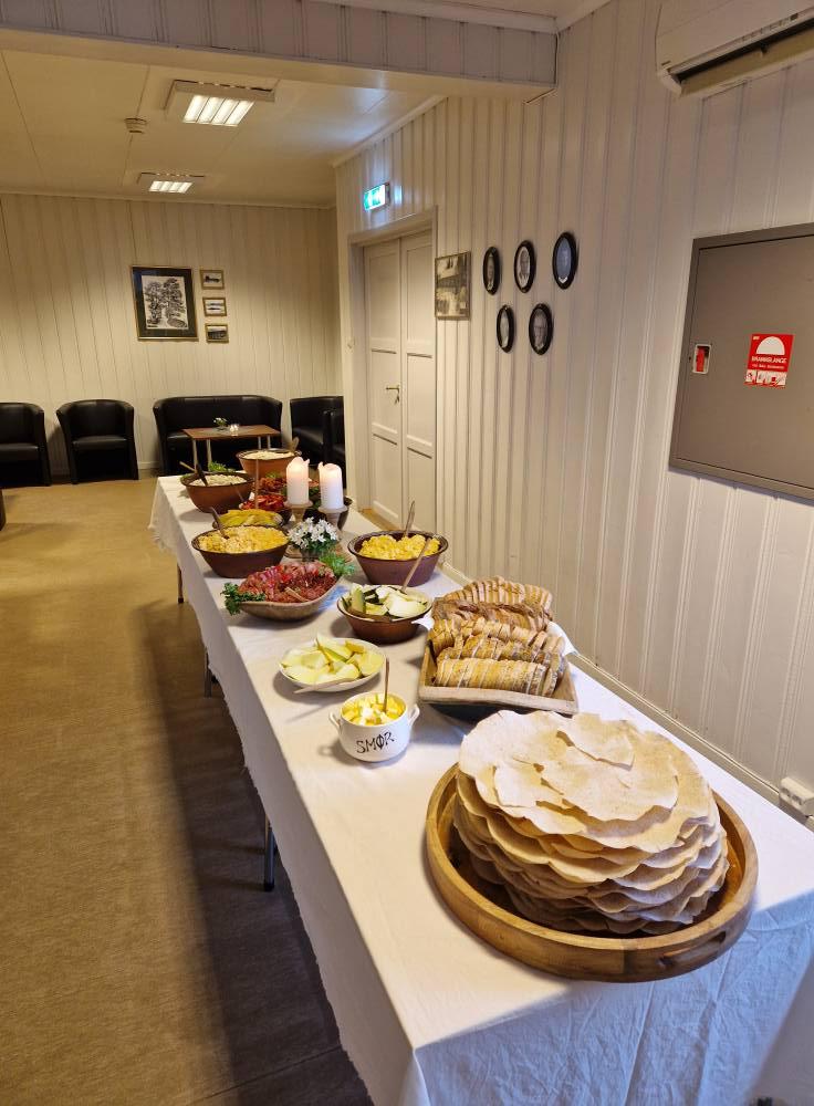 Vi serverte spekemat med deilig tilbehør, blant annet hjemmelagde flatbrød. Det var også et flott kakebord.