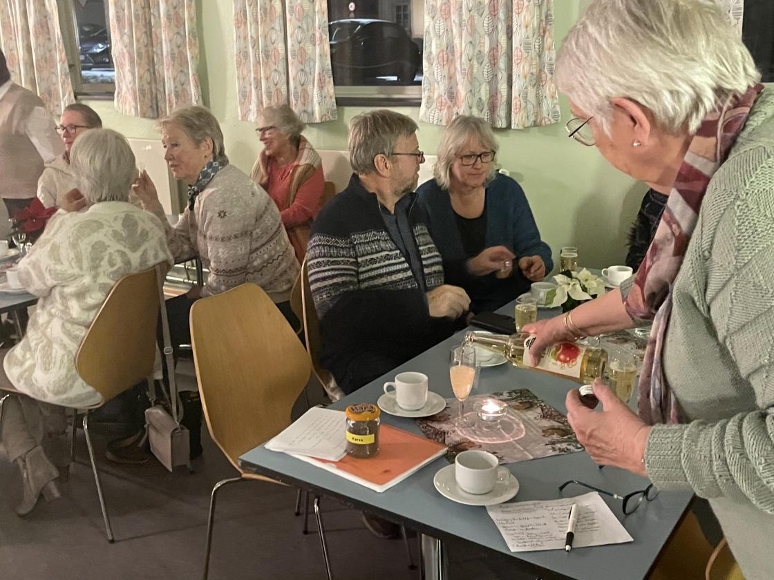 Som følge til de edle dråper ble det servert deilige lefseruller med sylte og laks, og kveldens vertinner fristet oss med saftige kaker og kaffe til dessert.