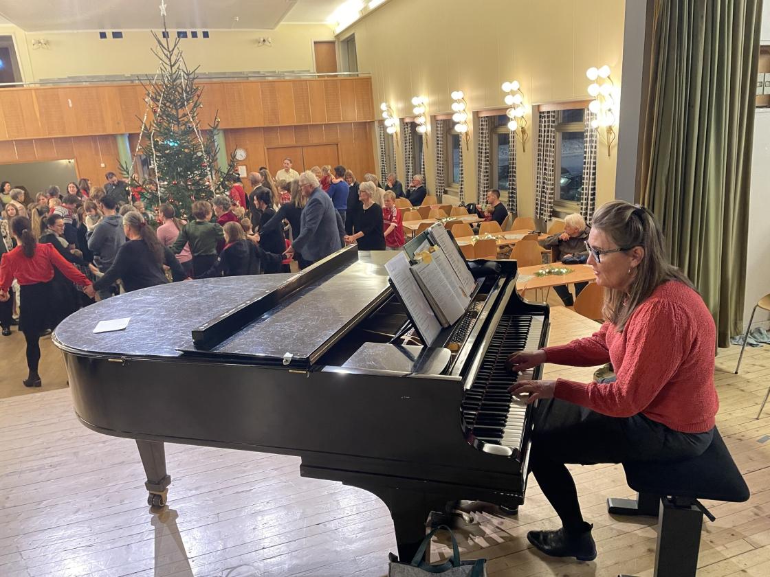Annemor Skuterud holdt orden på gangen rundt juletreet, mens Ragnhild Dahl trakterte pianoet.