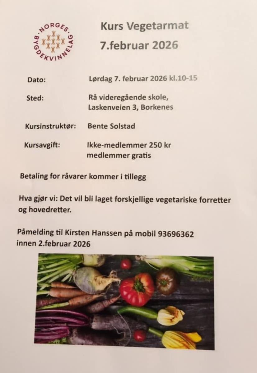 "Plutselig" får du medlemmer i familien som ikke spiser kjøtt og fisk. Du skal lage middag... hva finner du på da? Kokk Bente Solstad viser oss noen aktuelle matretter, både forretter og hovedretter. Kursavgift: ikke-medlemmer kr 250,- Medlemmer gratis Betaling for råvarene kommer i tillegg. Påmeldingsfrist. 02.02. til Kirsten Hanssen mob 93696362