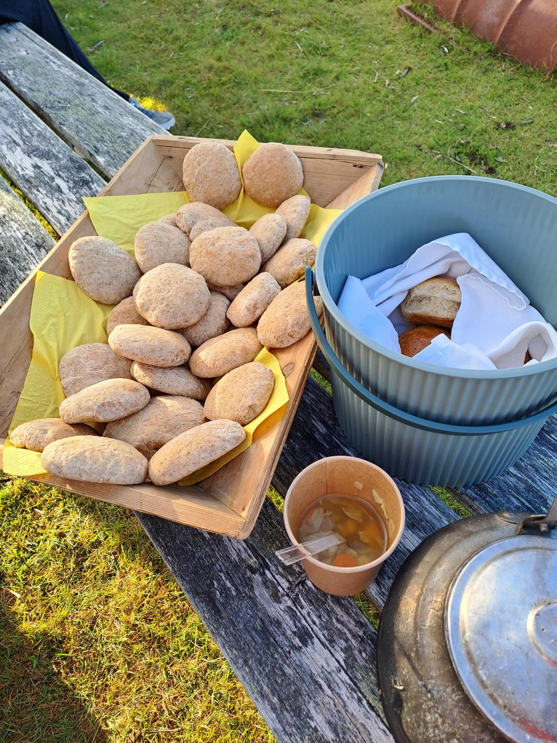 De oppmøtte koste seg med grønnsaksuppe kokt på lokale råvarer, klappakaker og bålkaffe.
