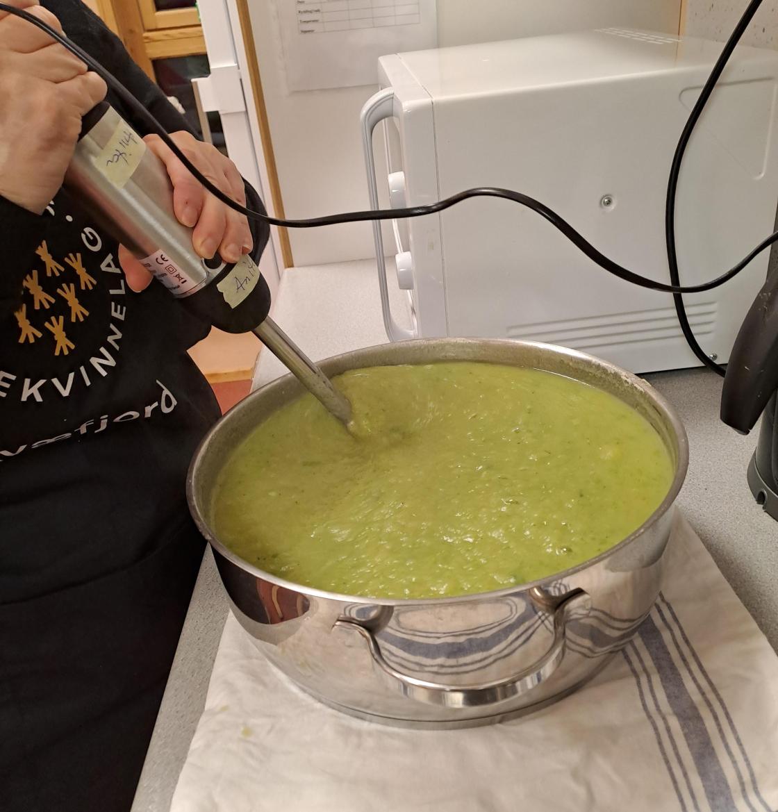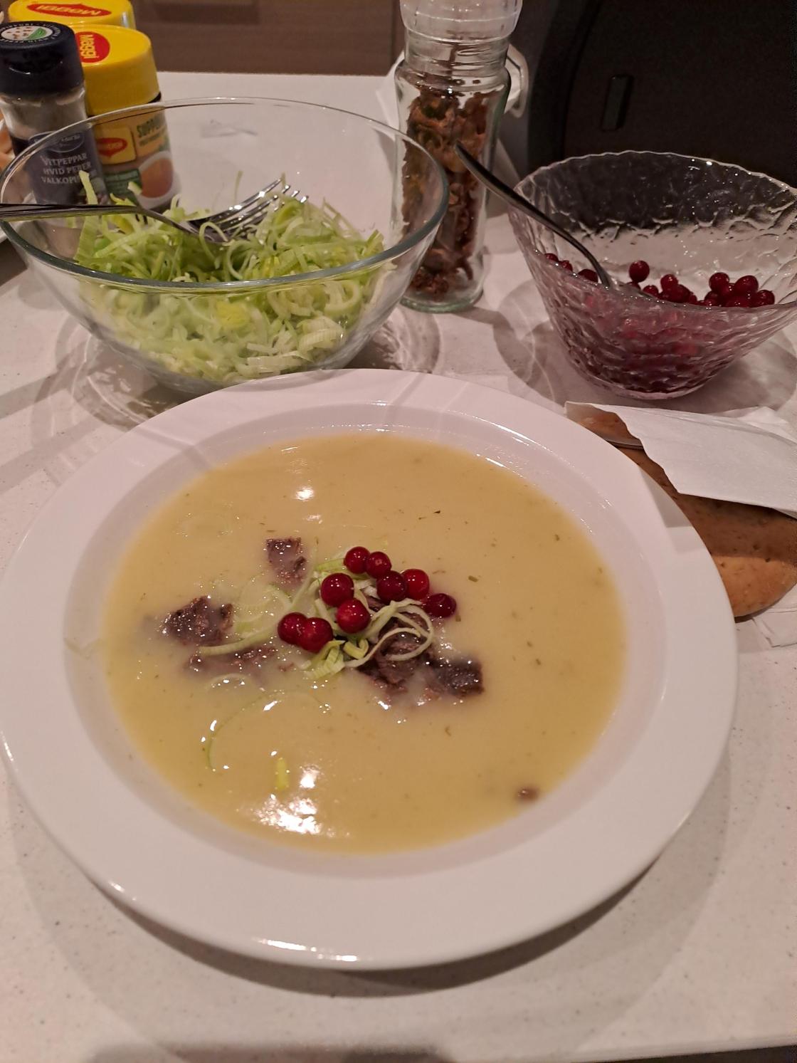 Menyen vår var potet- og purreløksuppe laget av lokale råvarer og med et dryss av sprøstekt finnebiff, purreløkinger og hele tyttebær. Og attåt serverte vi nydelig gahkko. Oppskrifta på potet- og purreløksuppa er selvfølgelig henta fra www.norsktradisjonsmat.no !