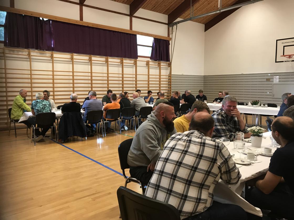 Nå er nyveien åpnet (om enn ikke innvidd) og de fleste som har jobbet på vegen drar videre til nye prosjekter. Meisingset Bygdekvinnelag inviterte til avskjedsmiddag i grendahuset. Gjestene var fra forskjellige bedrifter, også fra lokale entreprenører som har jobbet med anlegget.