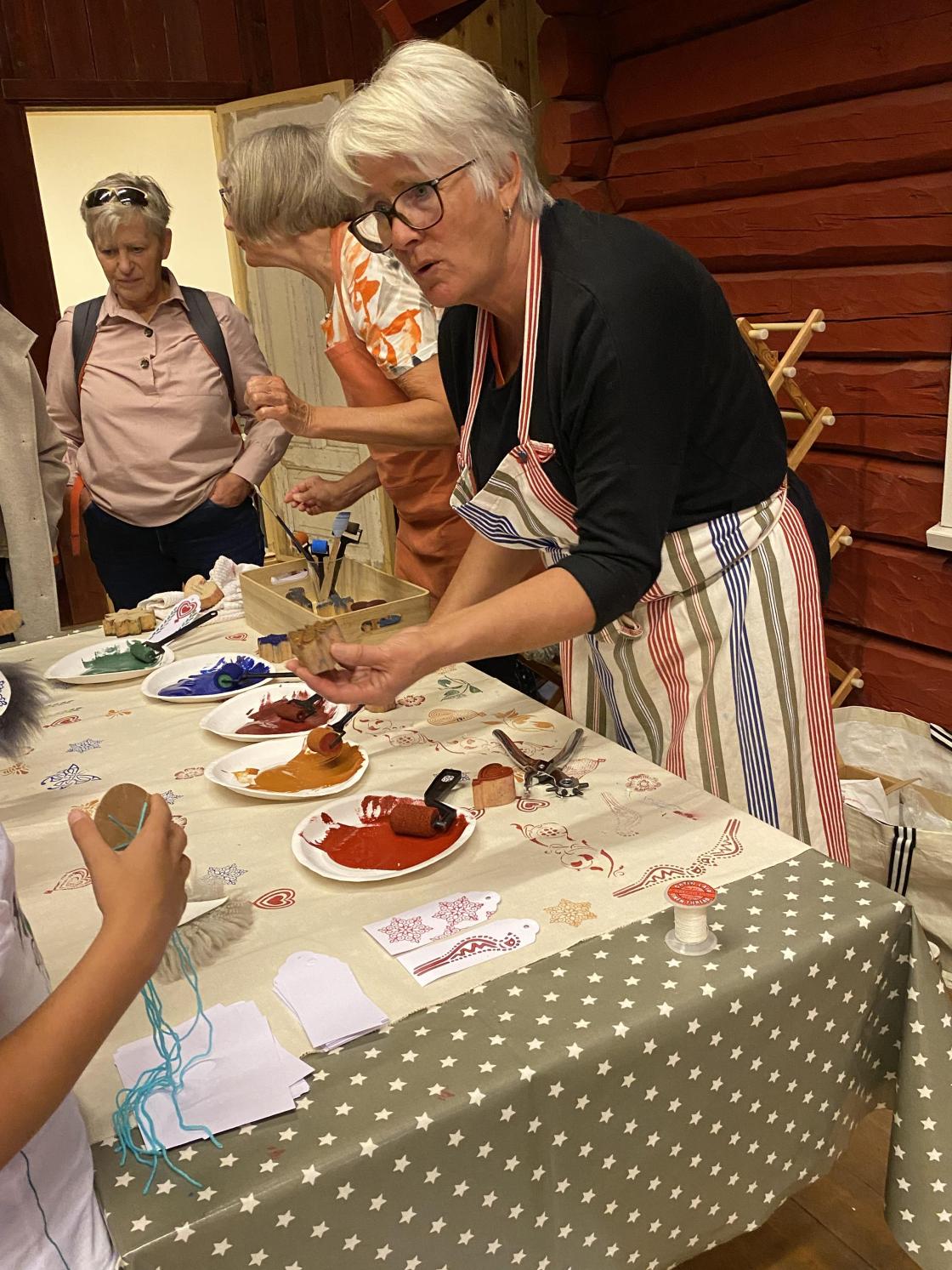 Der fikk også små og store lære seg flatbrødbaking og de minste trykket motiver på skinn, slik vi gjorde da vi sydde votter i vinter. Mange var innom oss og kanskje får laget noen nye medlemmer i løpet av høsten?