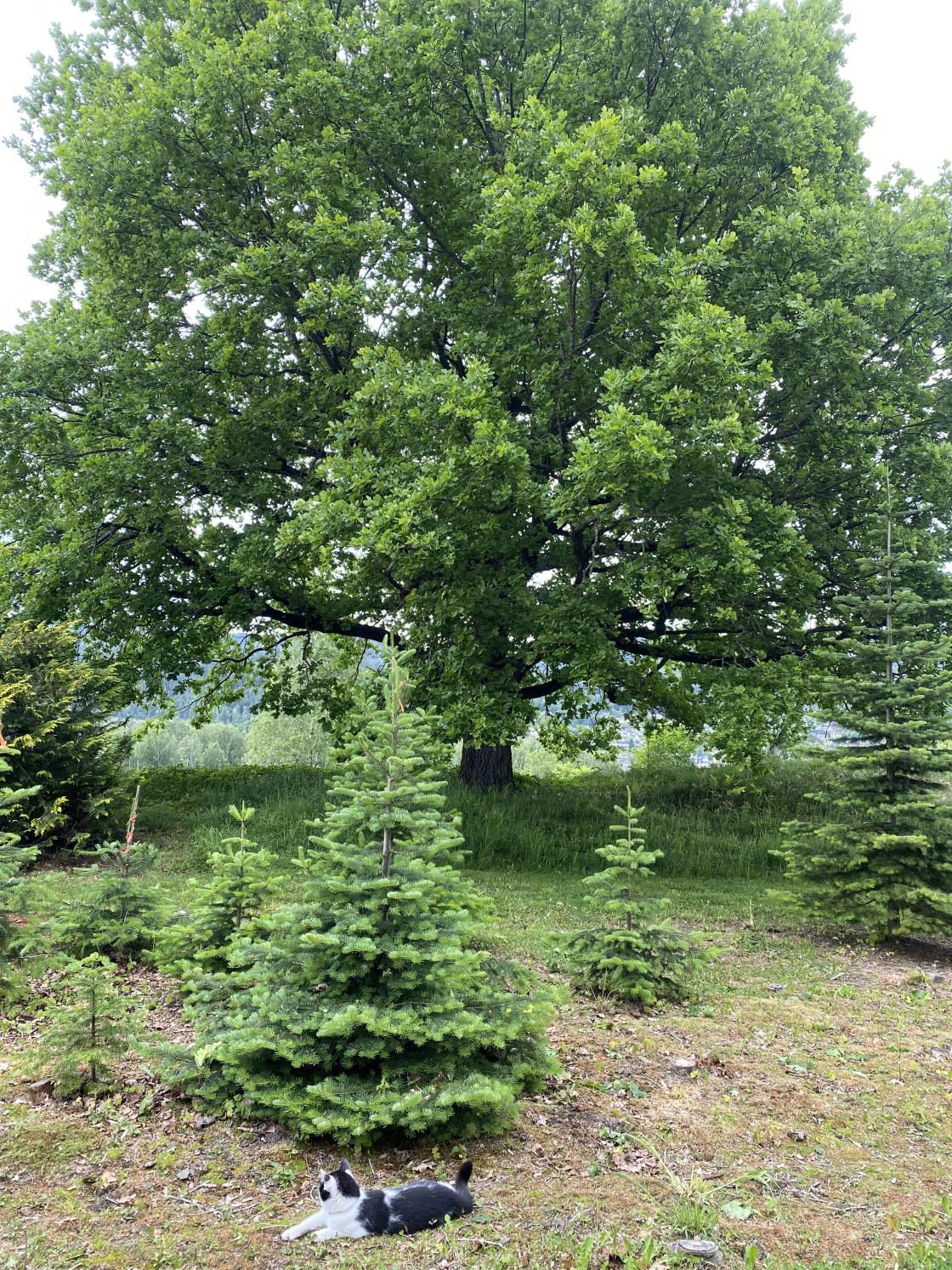 Det ble en fin rusletur blant små og store trær i selskap med en av gårdskattene og vi avsluttet med bildefremvisning inne i verkstedet, som folket på Grav bruker når de selger juletrær, kranser og annet før jul.