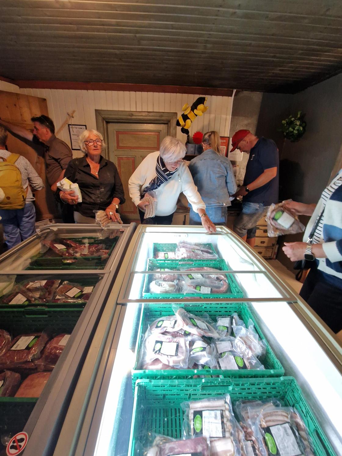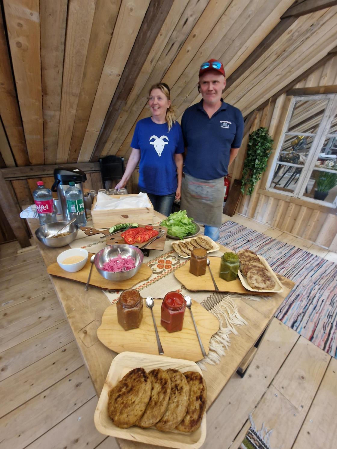Og selvfølgelig fikk vi servert grilla hamburger fra gårdens egne griser med mye godt tilbehør. Mette og med mye ny kunnskap avsluttet vi med en runde i gårdsbutikken.