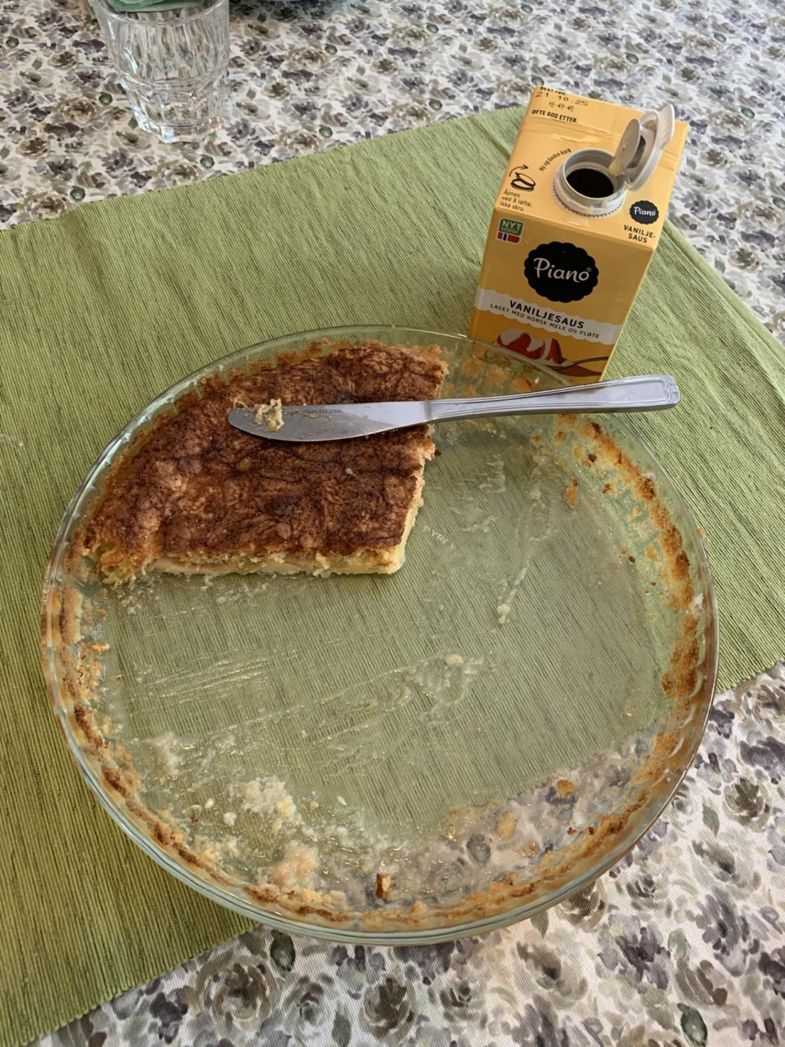 Menyen denne torsdagen var pølsegryte og potetmos, med rabarbrakake og vaniljesaus til dessert. Det ble ikke mye til overs. Nok en hyggelig dag for oss Måltidsvenner som denne dagen besto av Bente Aas-Haug og Nils Magnus Hovland