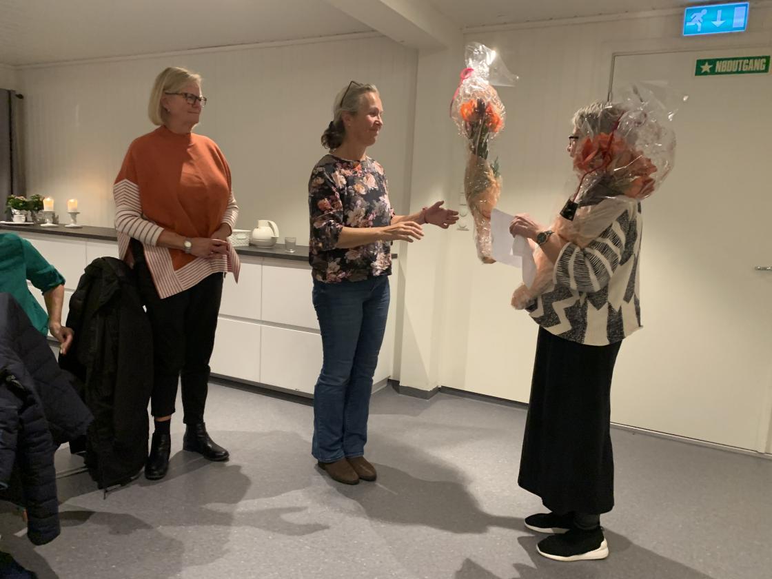 Styremedlem som gjekk ut av styret, May Brit Undheim og Ingrid Lund, fekk overrekt blomehelsing fra leiar Esther Falk som takk for den gode jobben dei har gjort.