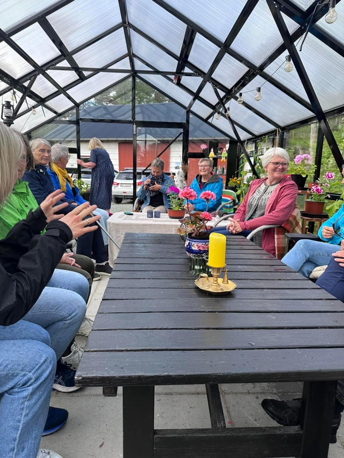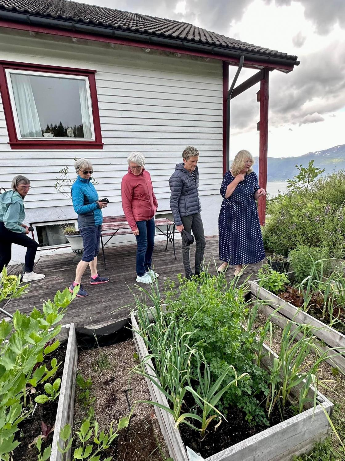 Torsdag 30. mai var ein gjeng med kjekke damer frå Omvikdalen bygdekvinnelag på besøk hos Magrete Ask på Hatlestrand. Me vart raust ynskt velkomne og tekne med rundt i den spanande hagen på Ask. Mange ulike planter og trær, pryd- og nyttevekster var det der. Veksthus, paviljonger og hytte var sett opp rundt bustadhuset. Noko for kvar ein smak. Her kunne du slappa av attmed peisen, kikka på moskusender i dammen, nyta utsikten frå ein benk eller sitja godt i drivhuset og smaka på alt det gode som var «trylla» fram av tidlegare avlinger.