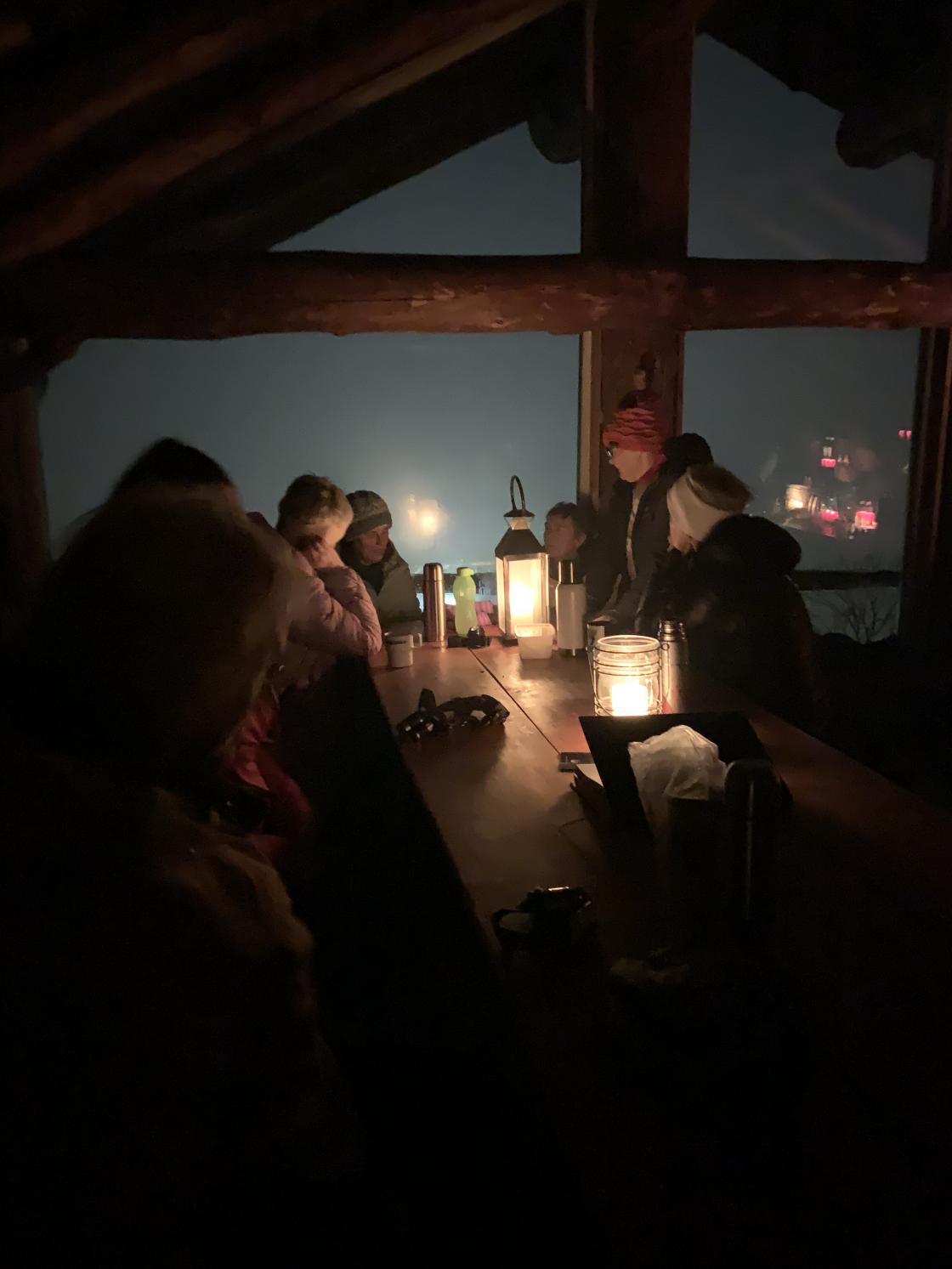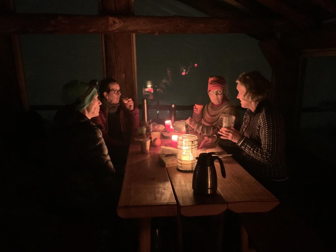 13 damer møttes til tur og sosialt samvær. Bjørg og Marian hadde gått opp litt på førehand og fyrt i peisen. Medbragt niste og drikke smakte fortreffeleg. Ein kjekk kveld! Lett snødryss på veg oppover og eit glimt av månen på heimveg.