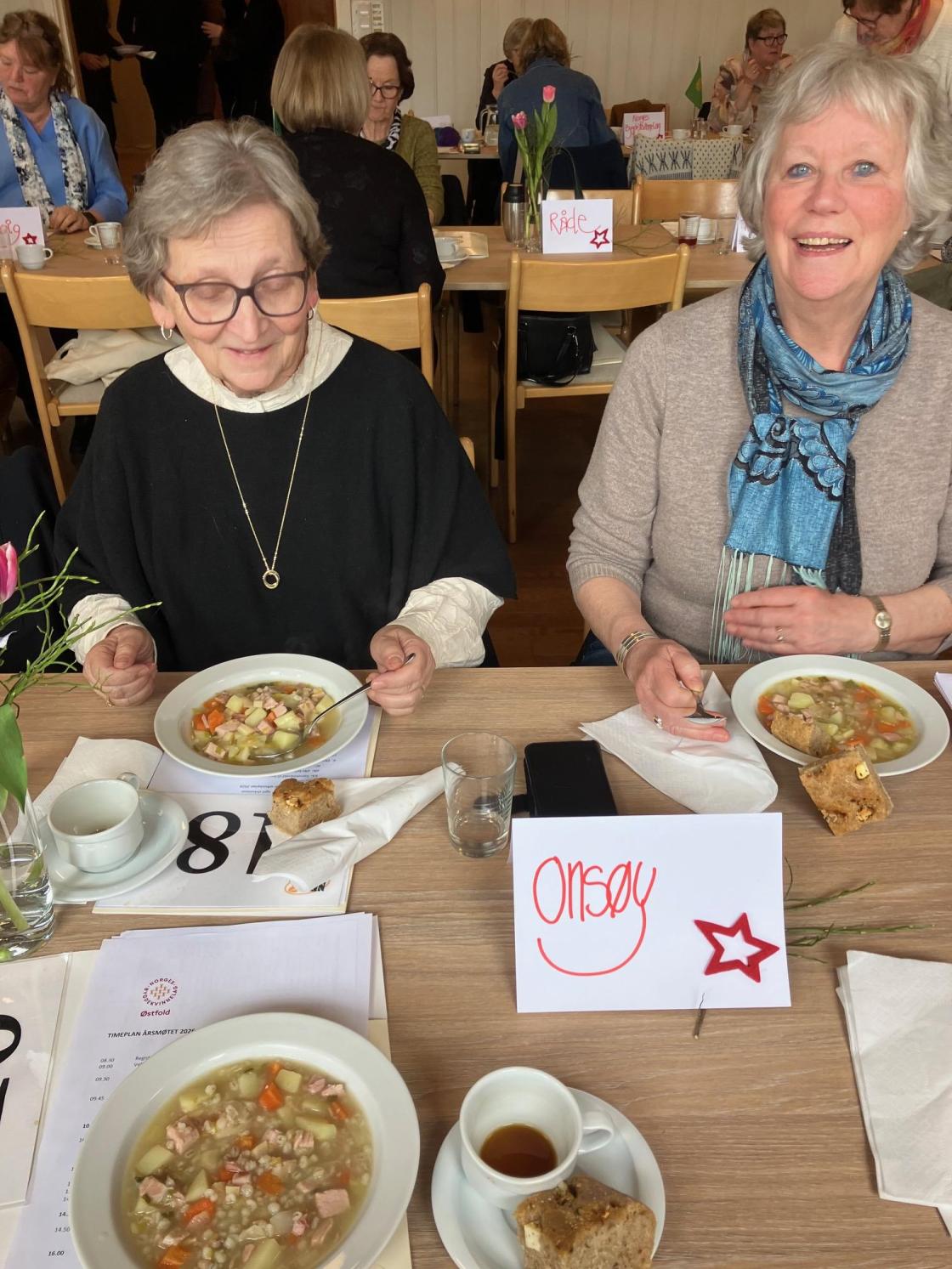 Årets årsmøte i fylkeslaget ble arrangert på Fossnes Grendehus i Hobøl lørdag 7.mars og vertskapet var Hobøls tre lokallag: Tomter, Øvre Hobøl og Ytre Hobøl Bygdekvinnelag. Delegater fra Onsøy Bygdekvinnelag var June Vallestrand, Annemiek Forsetlund og May Britt Bischof, og årsmøte ble gjennomført på tradisjonelt vis. Generaldebatten gikk rolig for seg uten konfrontasjoner og høy temperatur, og Barbro Kvaal fra Marker tok gjenvalg som leder. Noe mange av oss er opptatt av på årsmøter er serveringen, og vi ble ikke skuffet. Til frokost ble vi servert svarthavregrøt og det er en næringsrik og smaksrik grøt laget av det norske urkornet svarthavre, og i 2025 var det en nordmann som vant VM i grøtlaging med denne oppskriften. Dette hadde vært noe og servert elevene på Slevik Skole. Til lunsj ble det også servert deilig norsk tradisjonsmat, nemlig «Betasuppe» med gode norske grønnsaker, kjøtt og byggryn. Det ble en hyggelig dag hvor man også fikk tid i pausene til å mingle litt med likesinnede.
