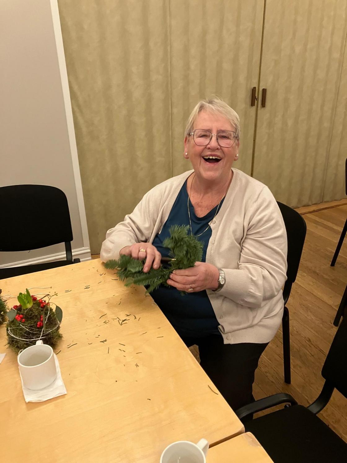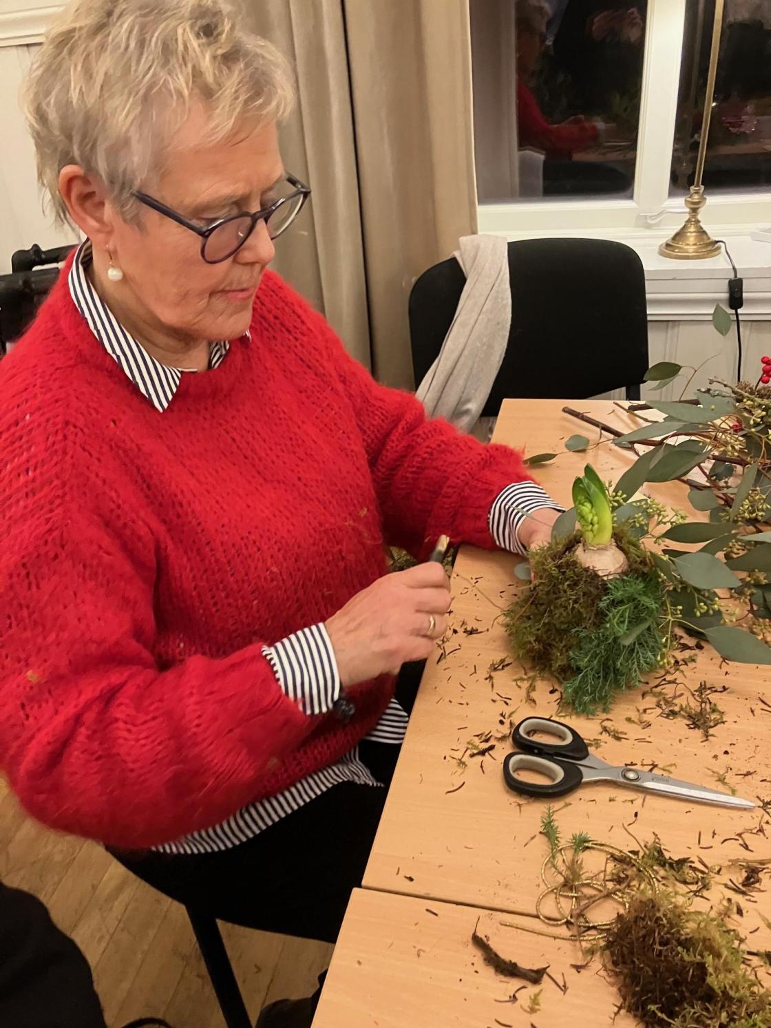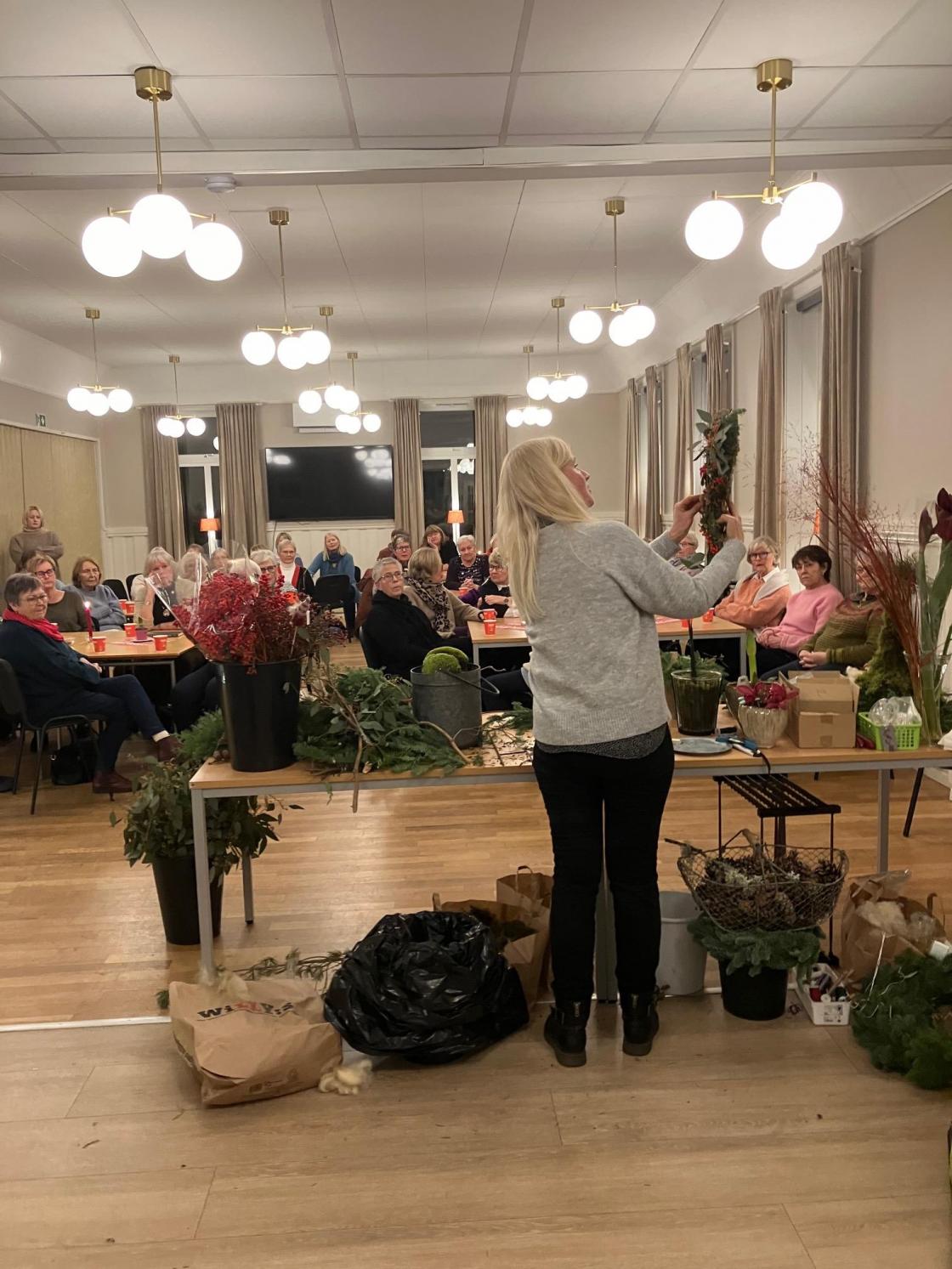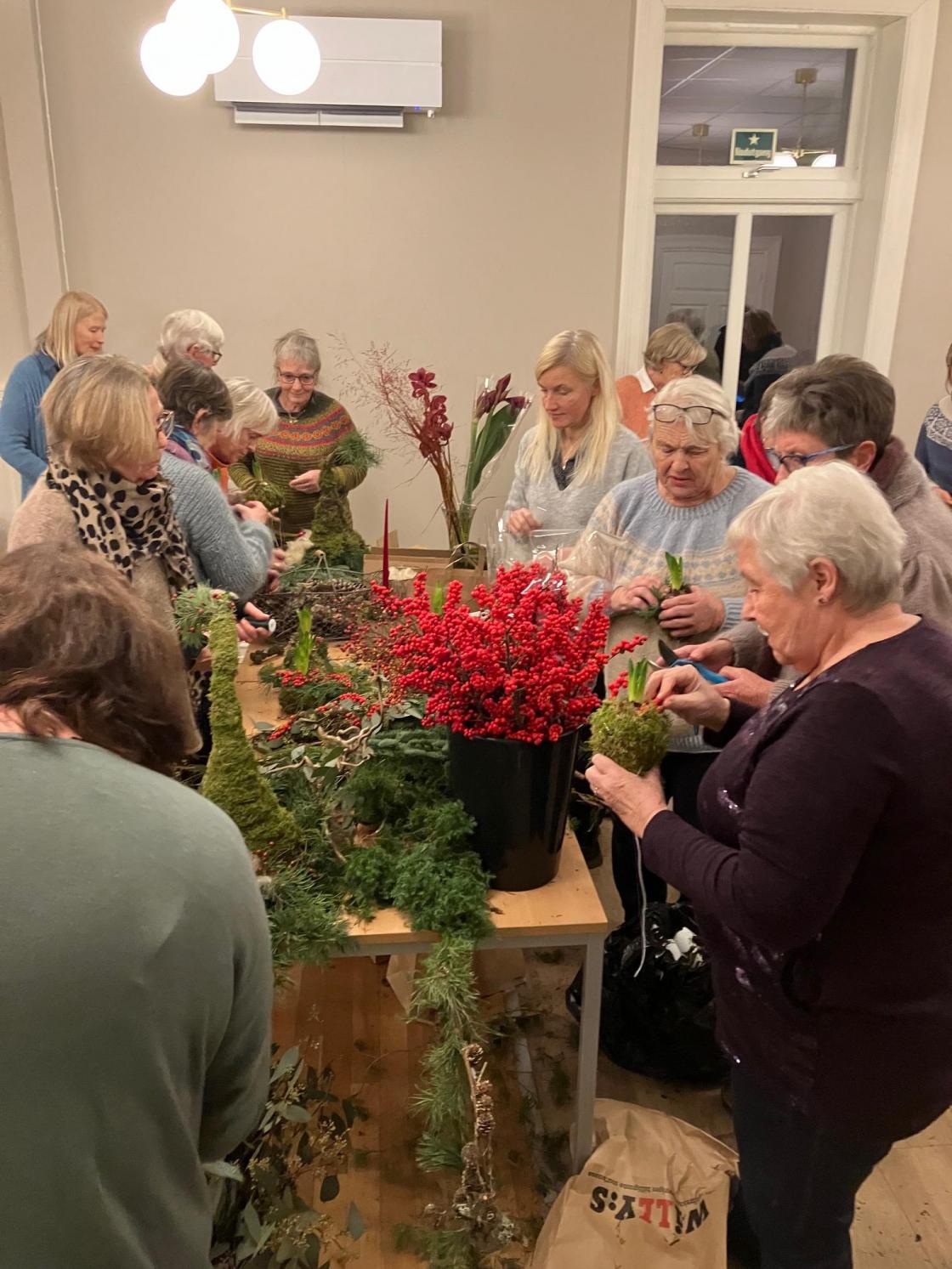 Det ble en hyggelig kveld på Bøndenes hus 27. november da leder i Onsøy Bygdekvinnelag June Vallestrand kunne ønske 45 damer (jenter) velkommen til et møte med inspirasjon og kreativitet. Kveldens foredragsholder Anita Solbrekke Hein ble dessverre forhindret fra å komme, men i hennes fravær stilte Carina Petterson ( Ilebys blomster) og det var en dame som kunne sakene sine. Etter en demonstrasjon på hvordan vi kunne skape magi av naturmaterialer var det klart for møtedeltakerne å prøve seg, og resultatene lot ikke vente på seg. Underveis i keativiteten ble det også servert marsipankake, julekake og hvetekake med brunost og gulost( her skal det sies at de måtte ha på ønsket pålegg selv). Som sagt ble det en fantastisk kveld og når det hele blir avsluttet med loddtrekning på utallige gevinster så blir det helt «knæll»