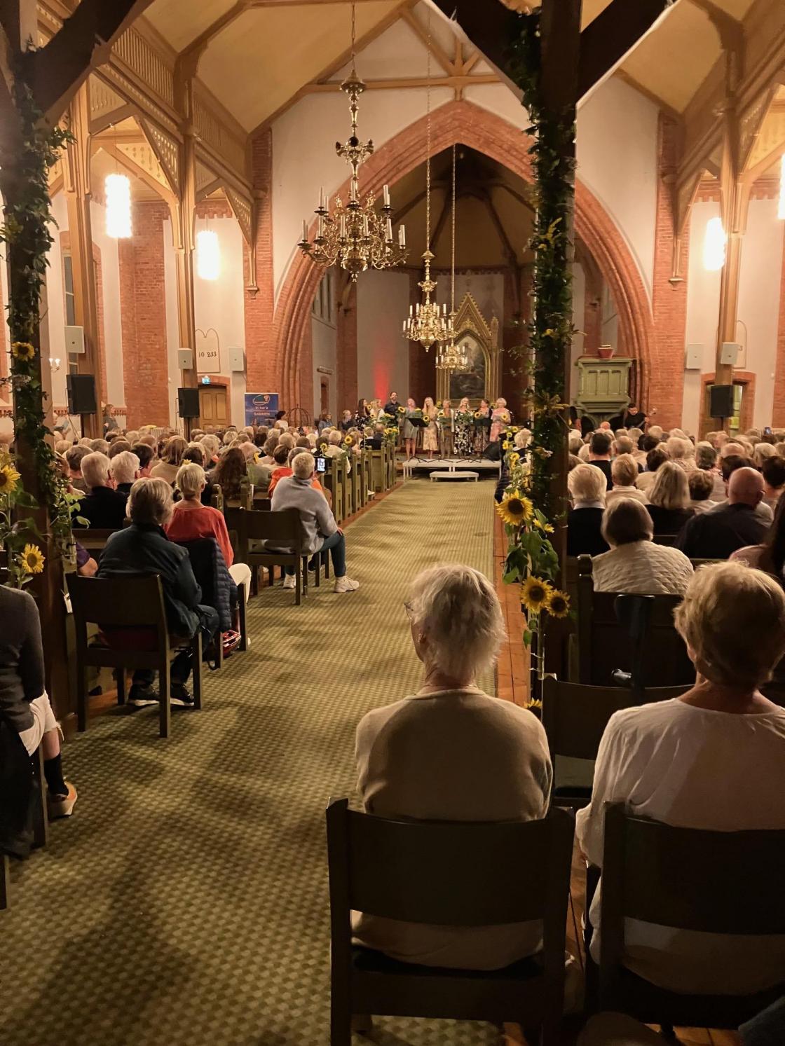 Kvelden opprant og det viste seg at det var flere enn 400 som ønsket å overvære denne konserten. Når kirken ble full ble krakker fra kirkeområdet plassert utenfor kirketrappen og dørene stod åpne så alle kunne få med seg det eventyrlige som foregikk inne. Vi forstod straks at her måtte noe gjøres og vi fikk delt solbollene i to slik at alle skulle få en smak, og i tillegg serverte vi cider (ikke kaffe). Dette ble servert i pausen og gikk veldig bra når så mange av våre medlemmer bidro.