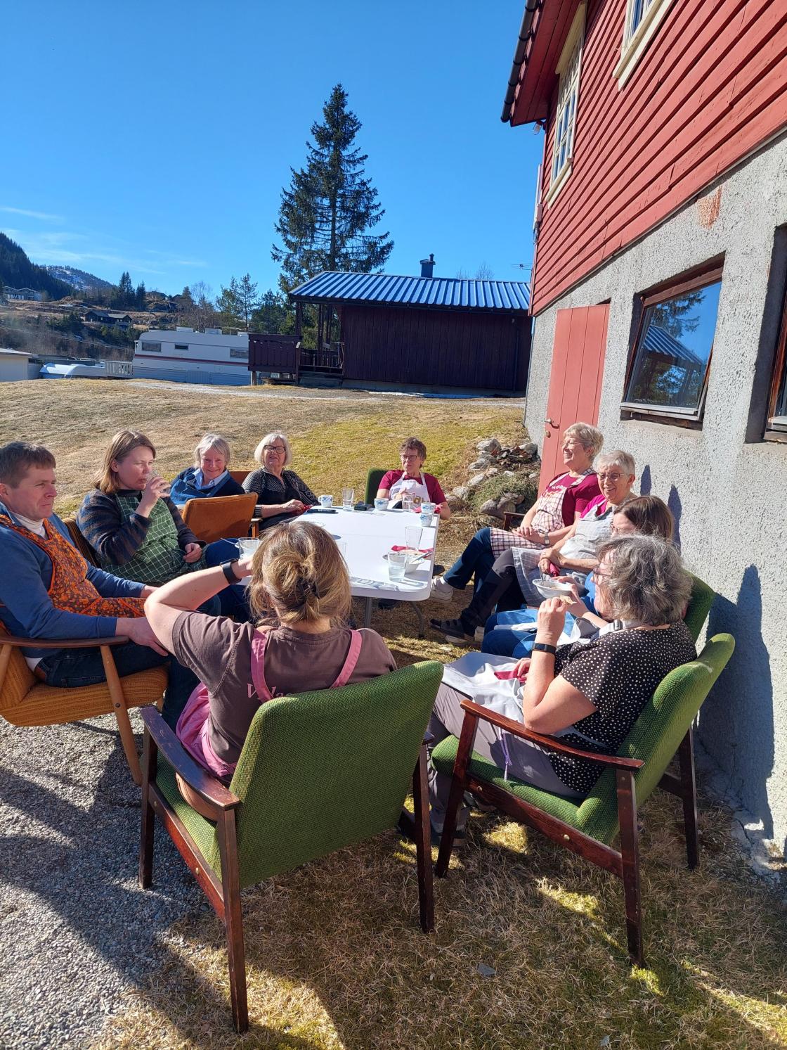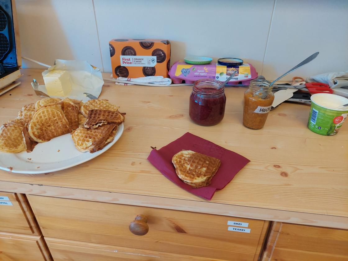 No var det på tide med ein liten matpause, betasuppen og vaflene fall i smak. Sidan veret var så fint, sette me oss ut i solveggen.