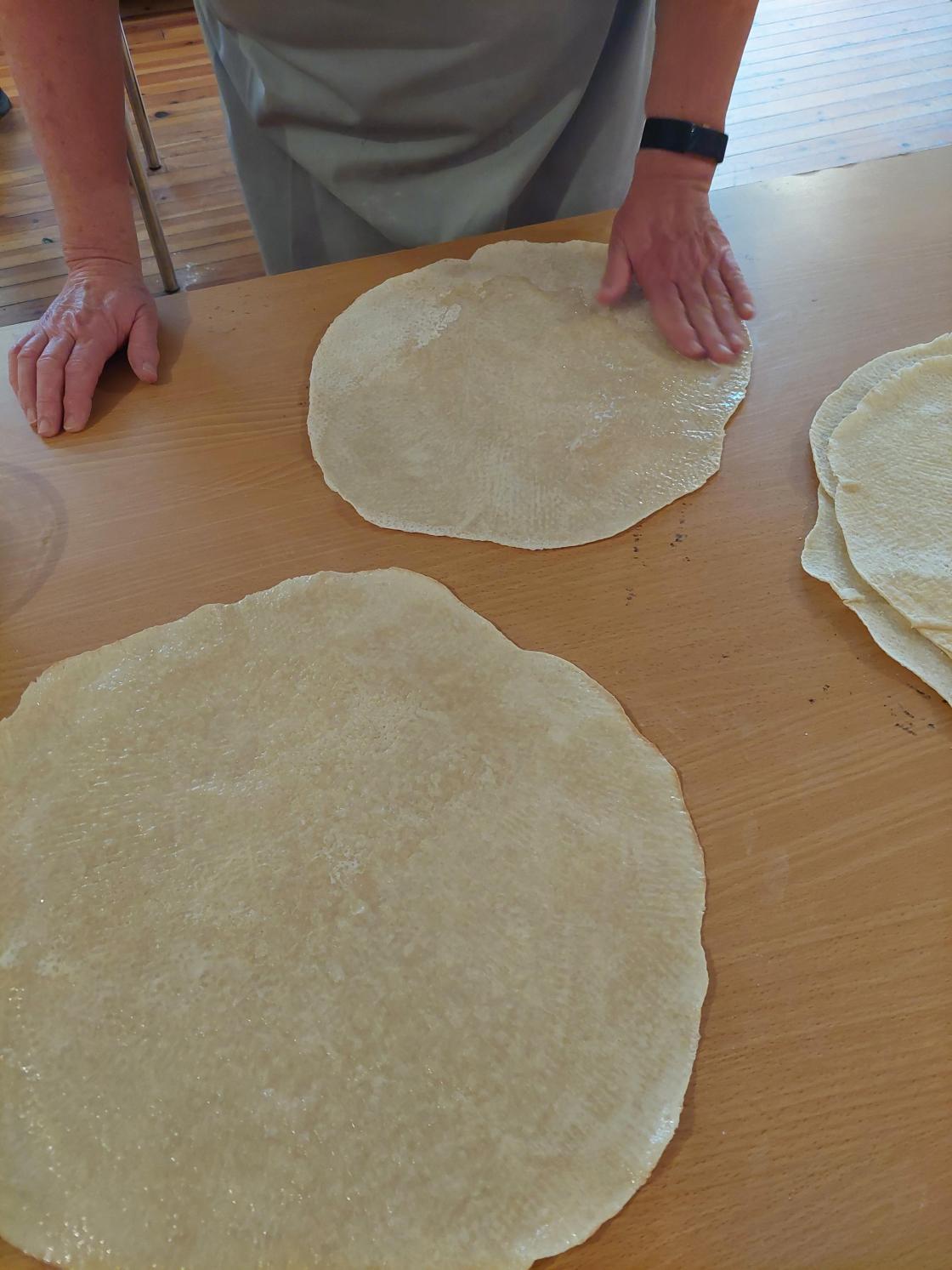 Me laga emne, kjevla ut leivar og steikte på eine sida og la i press.