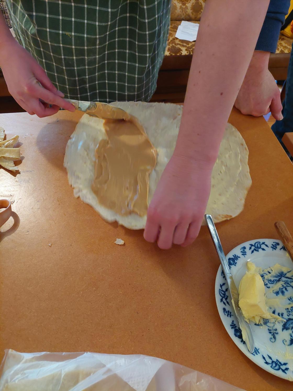 Neste steg var å bløyta leivane så dei vart klar for smyrjing, fyrst smør og så smyrja. Siste punkt var å klyppa dei opp i passelege bitar.