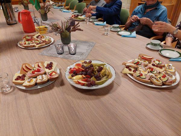 Me starta med maten denne gongen. Ruth og Ragnhild hadde laga til gode påsmurte rundstykker og frukt.