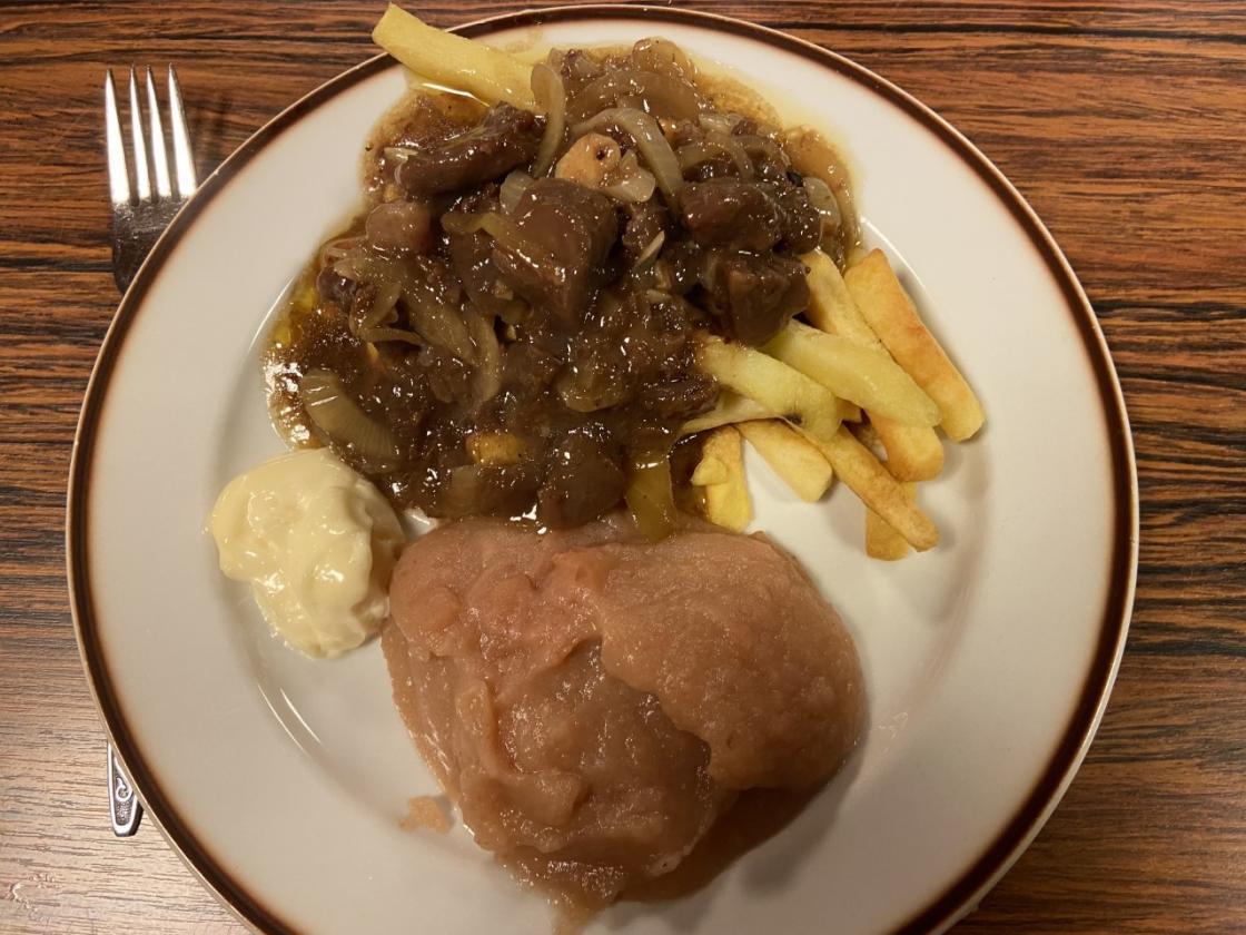 Nederland, laga og serverte retten Zoervleisj. Møyrt storfekjøt i sursøt saus, pommes
