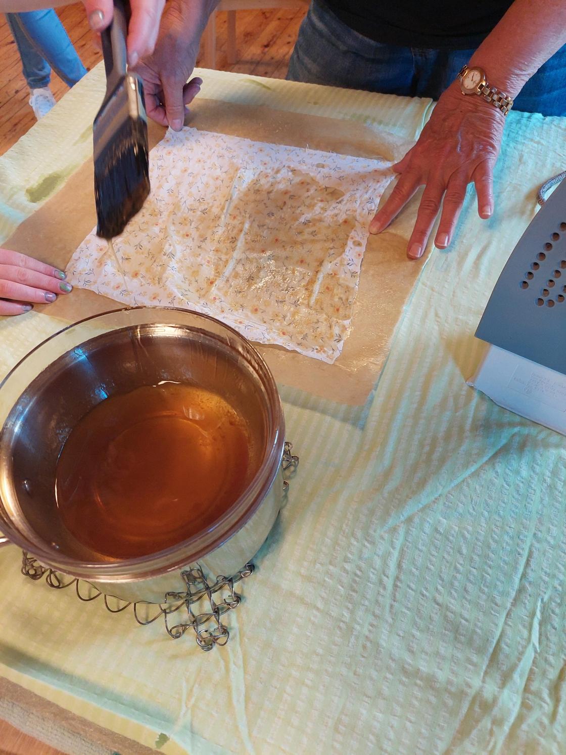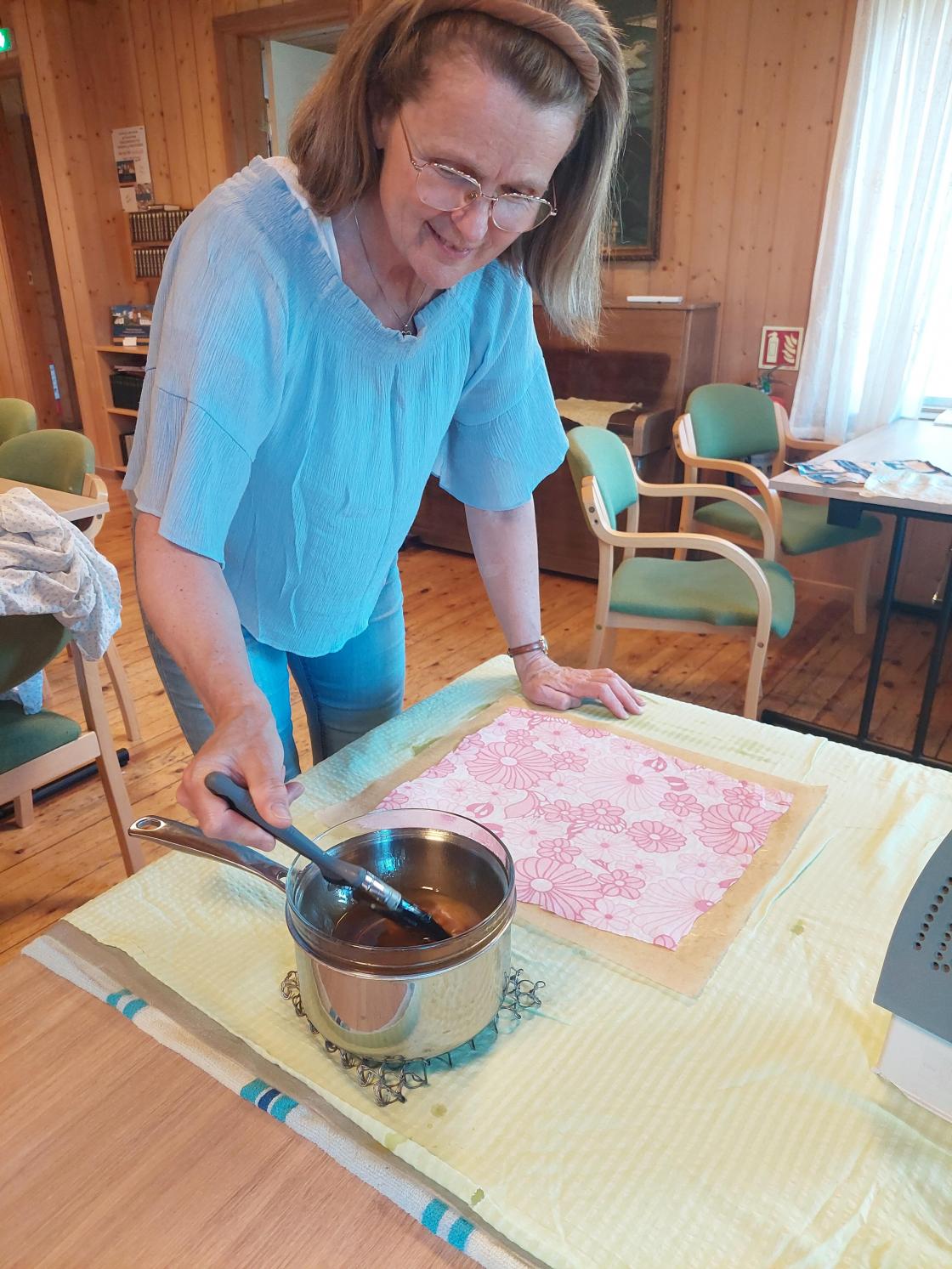 I prosjektet #nøysom har me hatt eit samarbeid med fredagsklubben på Oppheim. Siste fredagen i mai laga me bivoksark av gamle dynetrekk som me pensla med ei blanding av bivoks og harpiks. Desse arka kan erstatta plast i mange høve. Dei kan brukast til å pakka inn nistepakka eller brukast til å dekka over ei skål med matrestar i kjøleskapet.