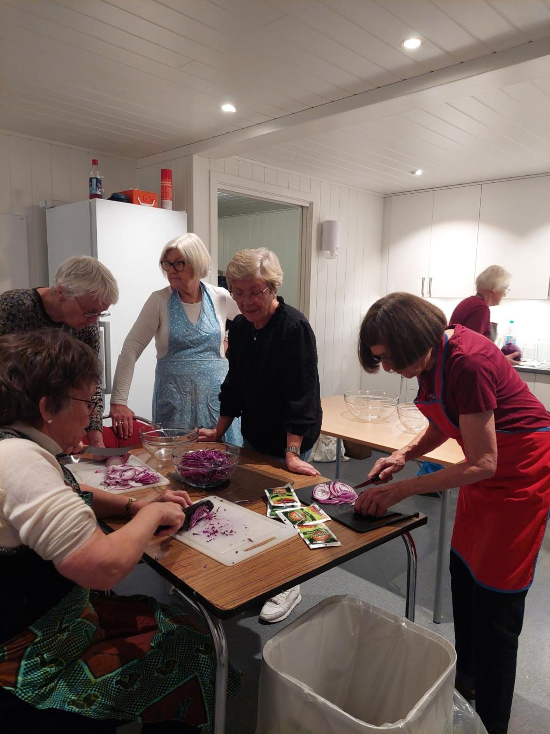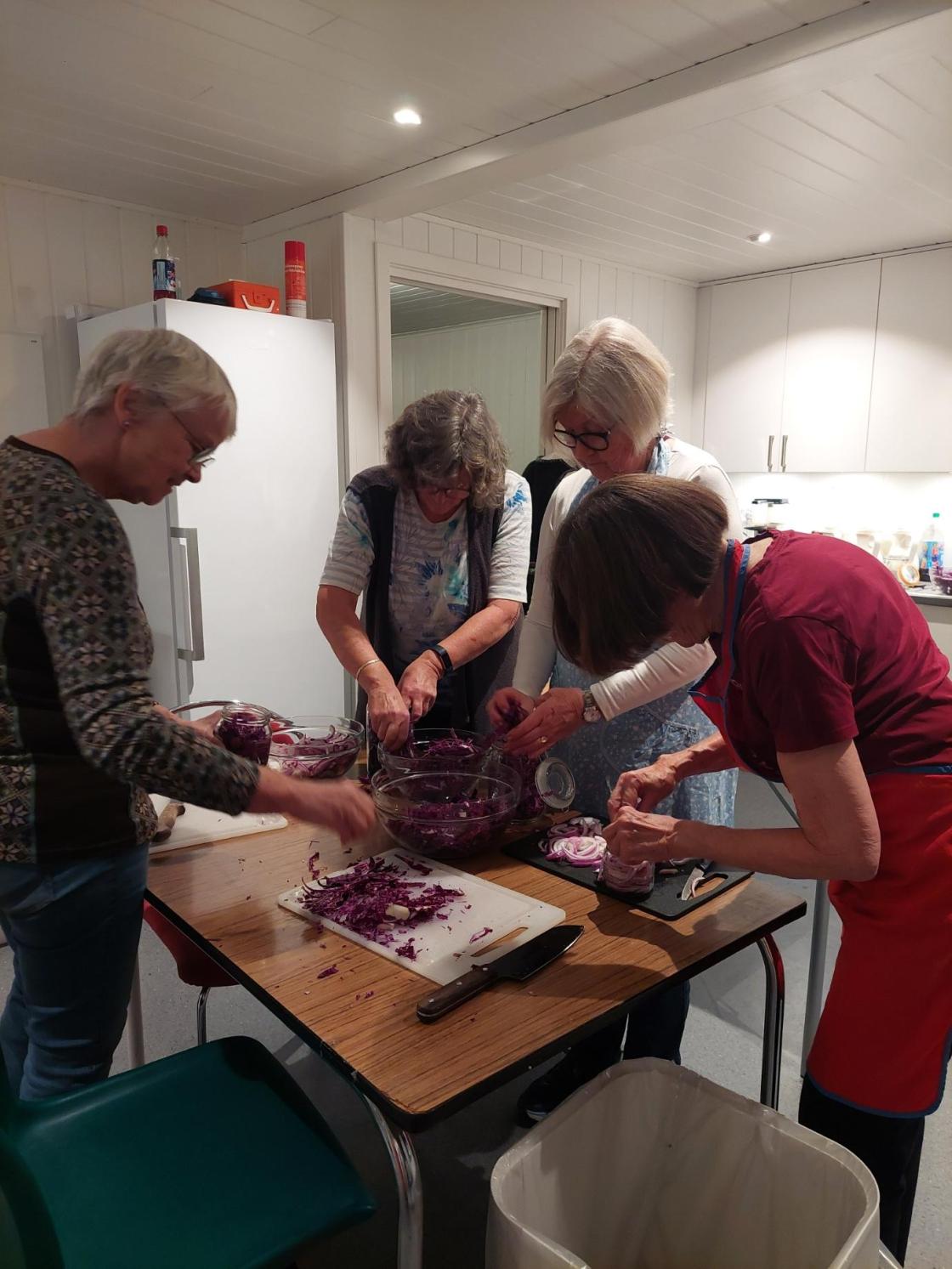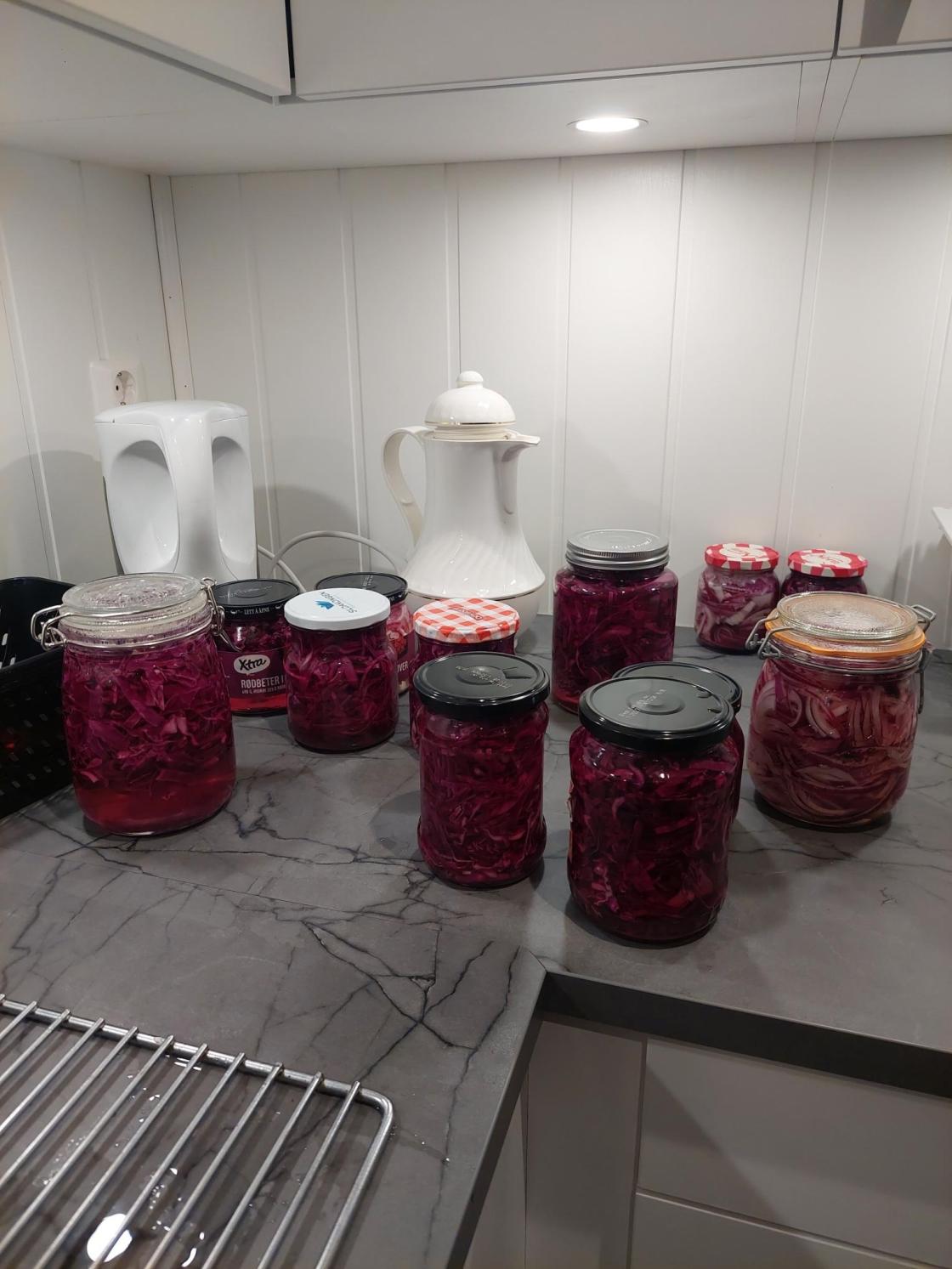 Me snitta raudkål og raudløk fint og stappa tett på varme glas, krydra med enten karve eller heil pepar og nellik. Til slutt fylte me på varm lake og skrudde på tett lok.