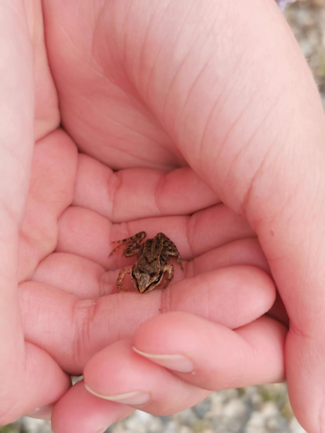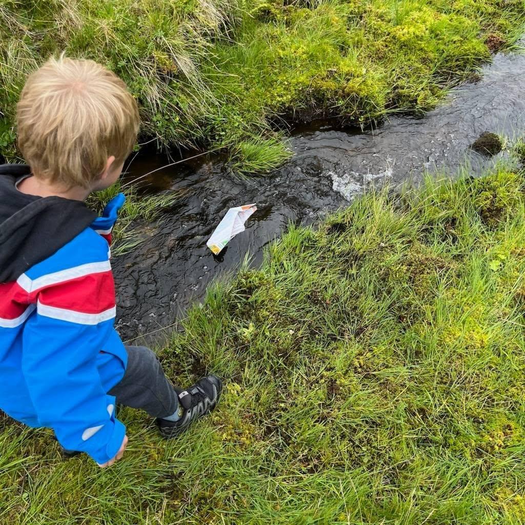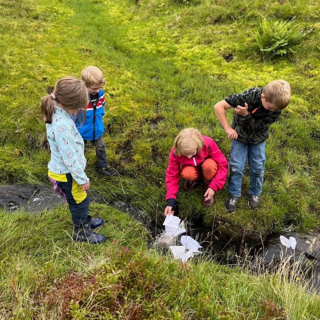 Ungane laga papirbåtar og hadde kappløp i groa. Der fanga dei òg frosk.