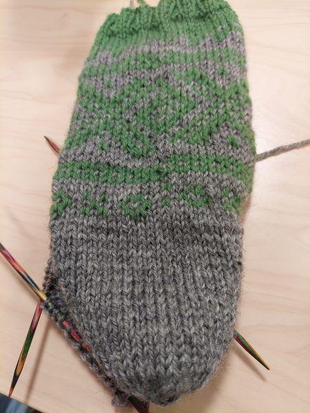 Det var fleire som strikka sokkar, og eit par unge jenter fekk kyndig hjelp med hælfellinga ![]()