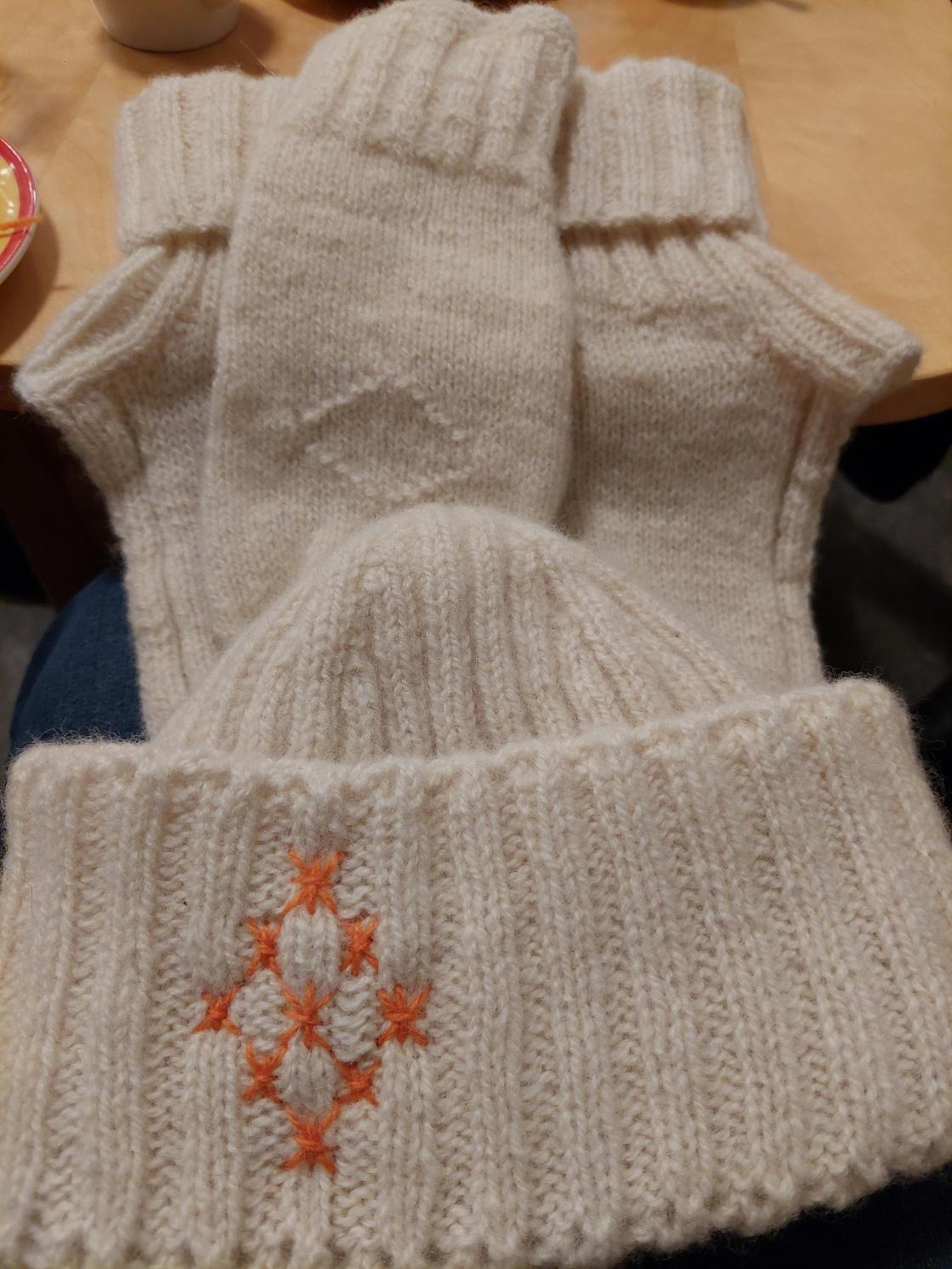Jenny har strikka hue, hals og vottar til #strikkung40 og Maries broderer på logo ![]()