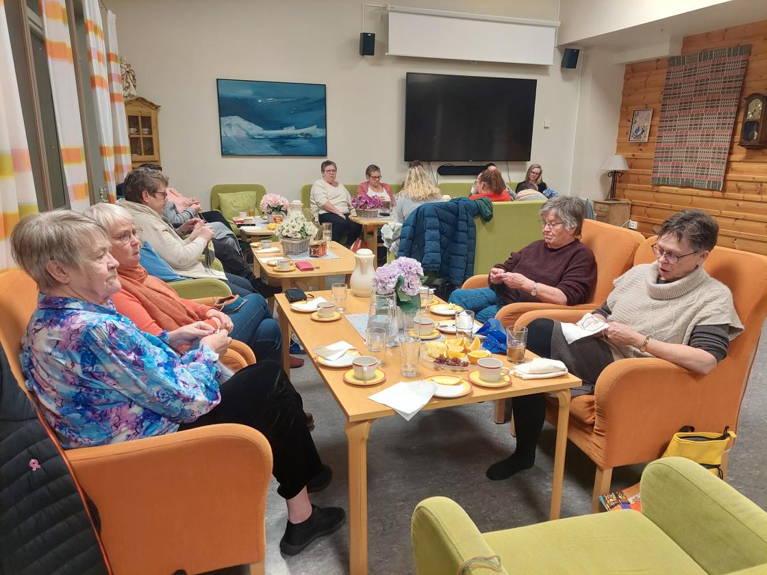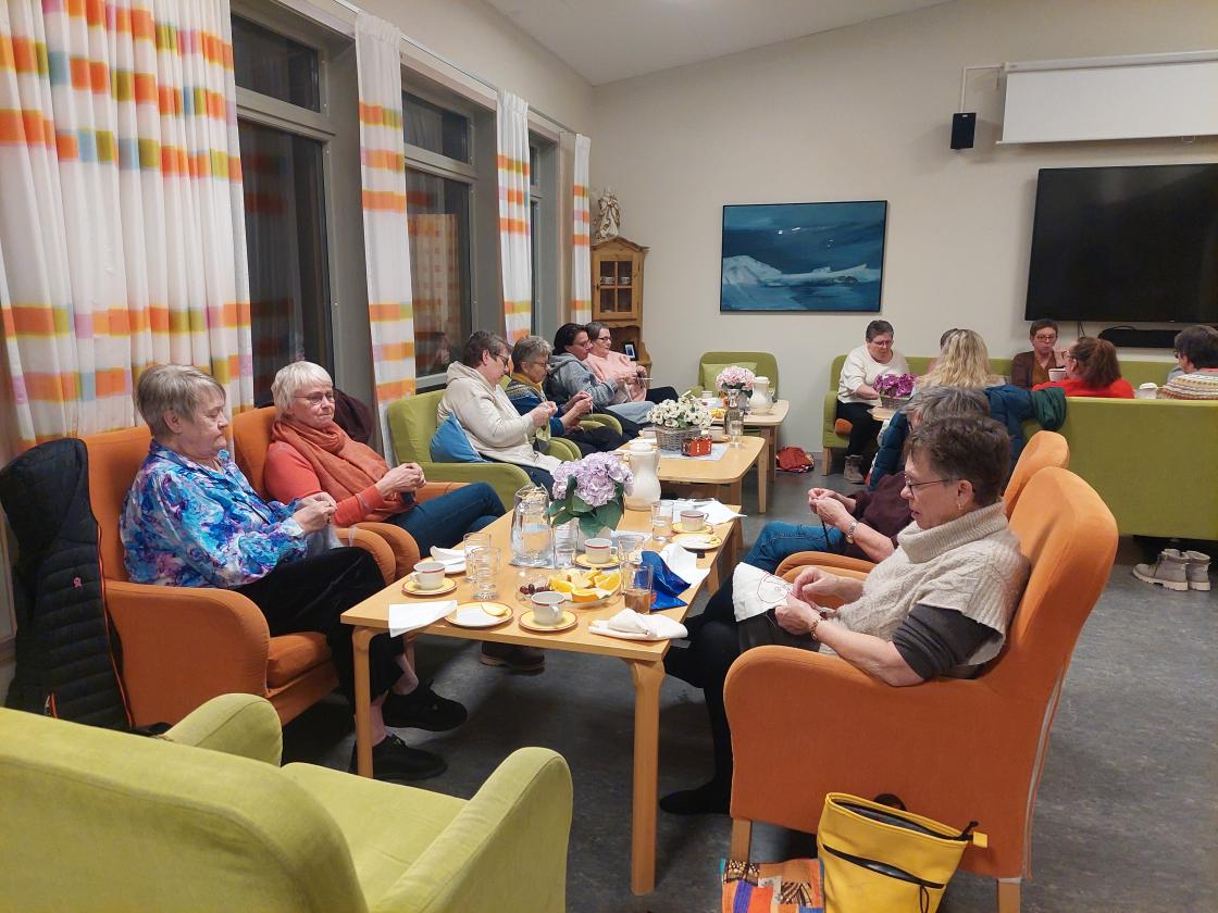 18 damer var samla denne kvelden. Her vart det strikka, hekla og brodert. Og praten gjekk livleg rundt borda ![]()