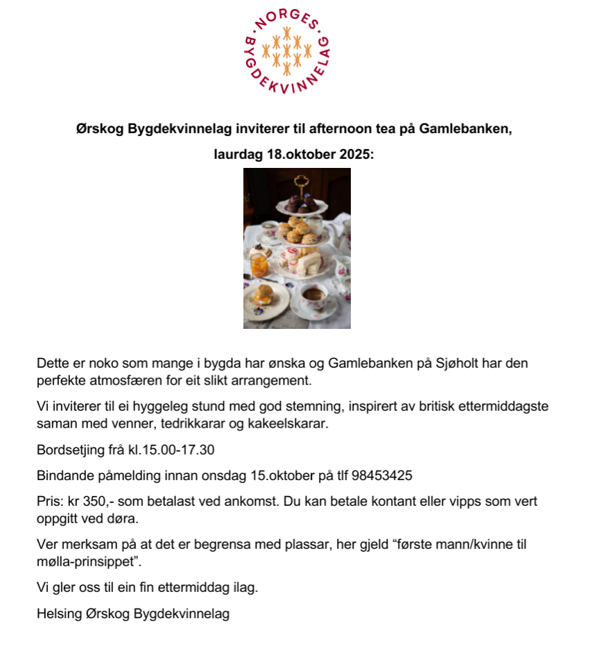 Forside Kontakt oss Om oss Topp 5 Oct 18 Sat Ørskog Bygdekvinnelag Afternoon tea Gamlebanken på Sjøholt lør 18.10.2025 15:00 - lør 18.10.2025 17:30 Tlf 98453425 Del på: