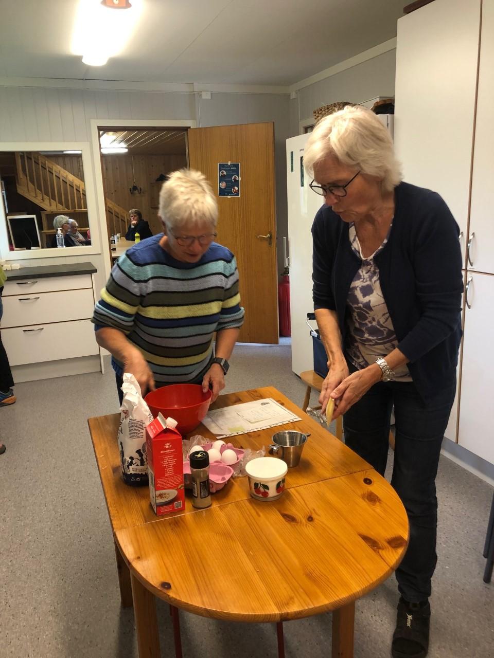 Maten ble laga av 13 personer, og det ble dekket til med langbord i storsalen. Åtte til dukka opp så vi til sammen ble en fin gjeng med 21 damer til maten. Under måltidet gikk praten om «løst og fast», i tillegg til at suppa med tilbehør ble tema. Hva foretrekker du? Melboller eller boller med potet, sur-søt saus eller pepperrotsaus? Uansett favoritt, måltidet ble avslutta med en velfortjent applaus til kokkene!