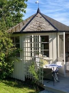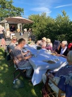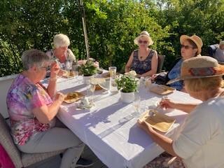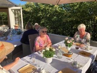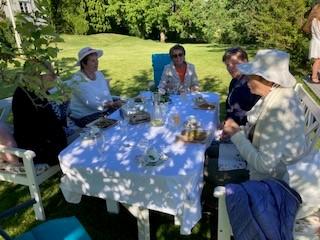 Hele 23 medlemmer møtte opp i flotte sommerhatter til en vakker sommerkveld i hagen på Aarneberg Gård. Vi dekket med hvite duker og sølv, og serverte våre gjester "rabarbra-bobler", "Bondens" hjemmelagede lapskaus og kaffe og kaker medbragt av styret.