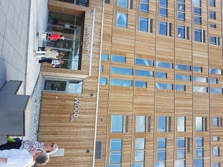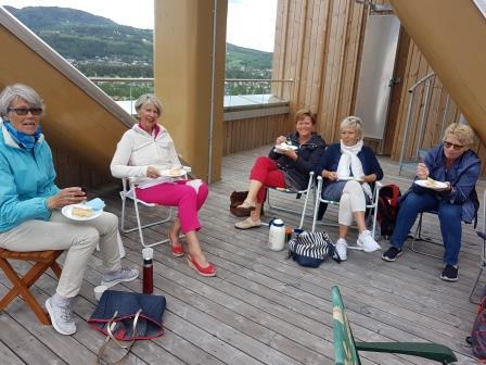 Som overraskelse på møtet var en kjentmann og da muligheten for og komme opp på den flotte verandaen i 18 etasje i Mjøstårnet. Stor takk til Lise for omvisning og orientering. Som kjent verdens høyeste trehotell så langt og hele 85,4 m. høyt. Det åpnet i mars 2019 og inneholder hotell, leiligheter, kontorer, restaurant, fellesområder og ikke minst svømmeanlegg. Mye av aktiviteten har sjølsagt vært laber nå i disse Corona tider, og mange restriksjoner hang fortsatt igjen, men når var det lov og kjøre heis – 3 stk om gangen. Vi hadde valgt en dag med laber bris i takene og regn og torden truet i horisonten. Utsikten der oppe i høyden var det imidlertid ikke noe og si på lell. Vi fikk gode muligheter for å gjøre seg litt kjent i Dala fra en heller ukjent vinkel for de fleste av oss. Riktig flott var det oppe på toppen.