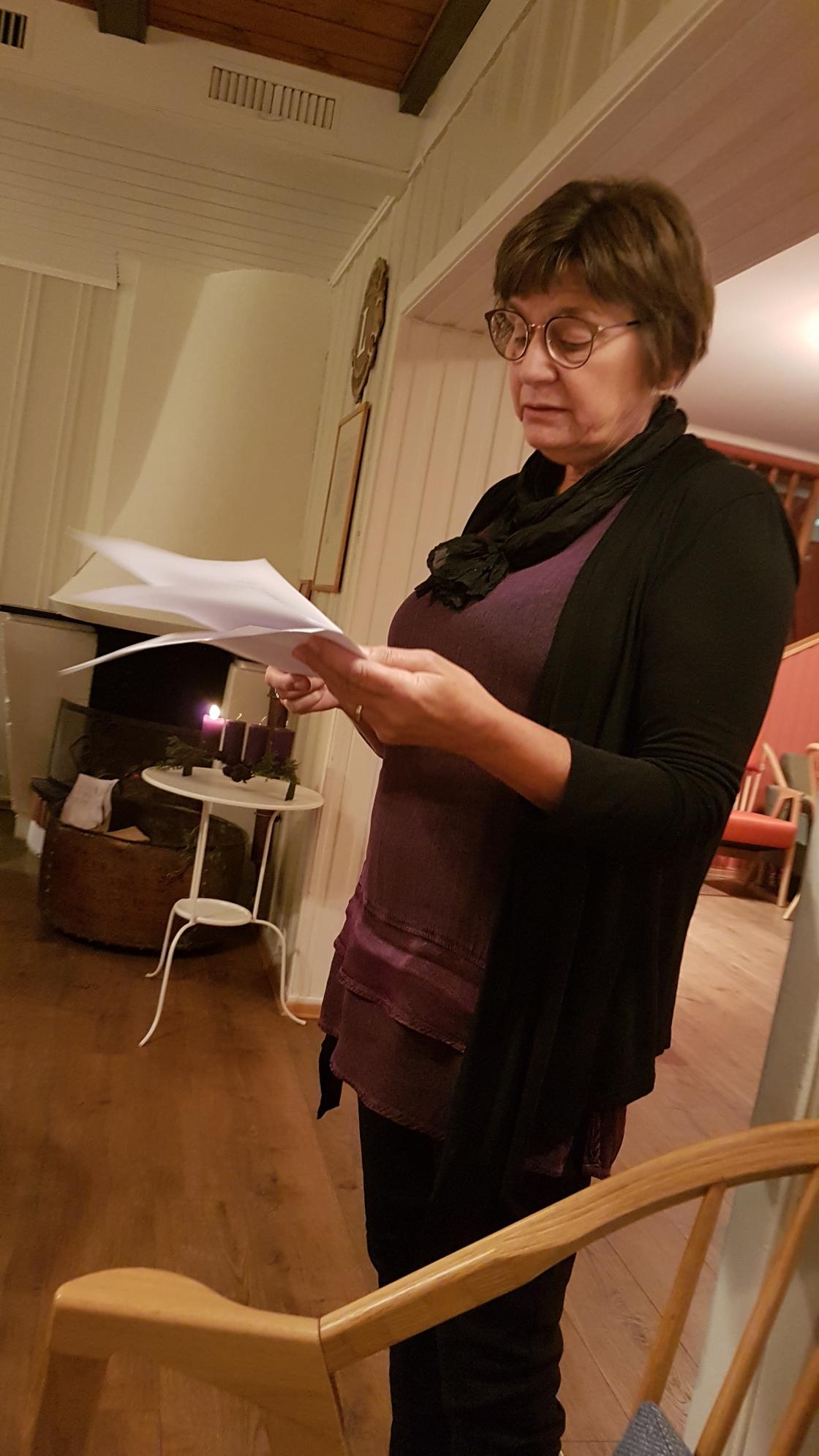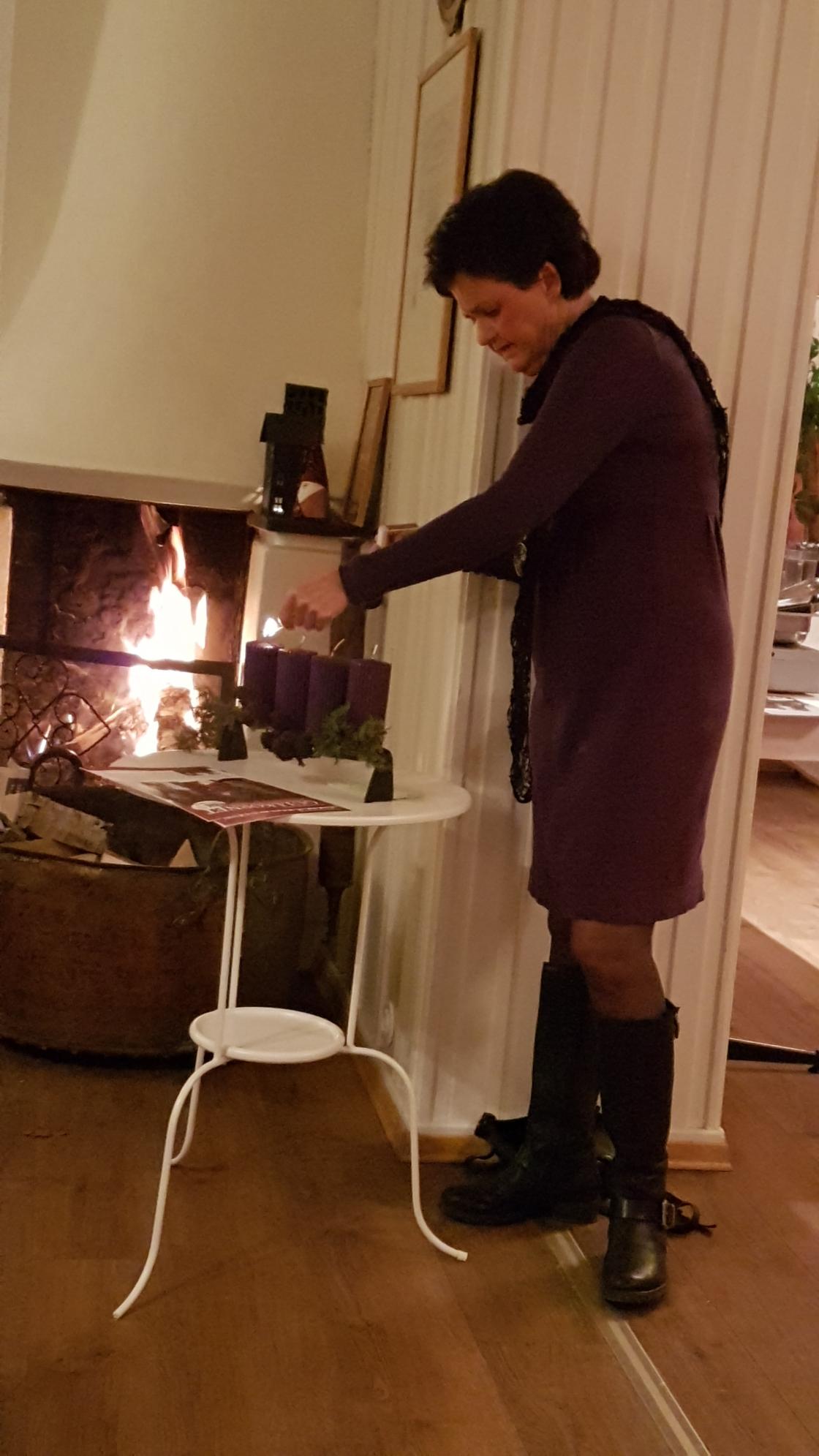 Vi ble ønsket velkommen og Anbjørg tente lys. Vi fortsatte inn til et julepyntet festbord. Den "røde stua" på Tingvang har blitt litt mindre rød og har fått nye flotte møbler. Det ble riktig så fint der.