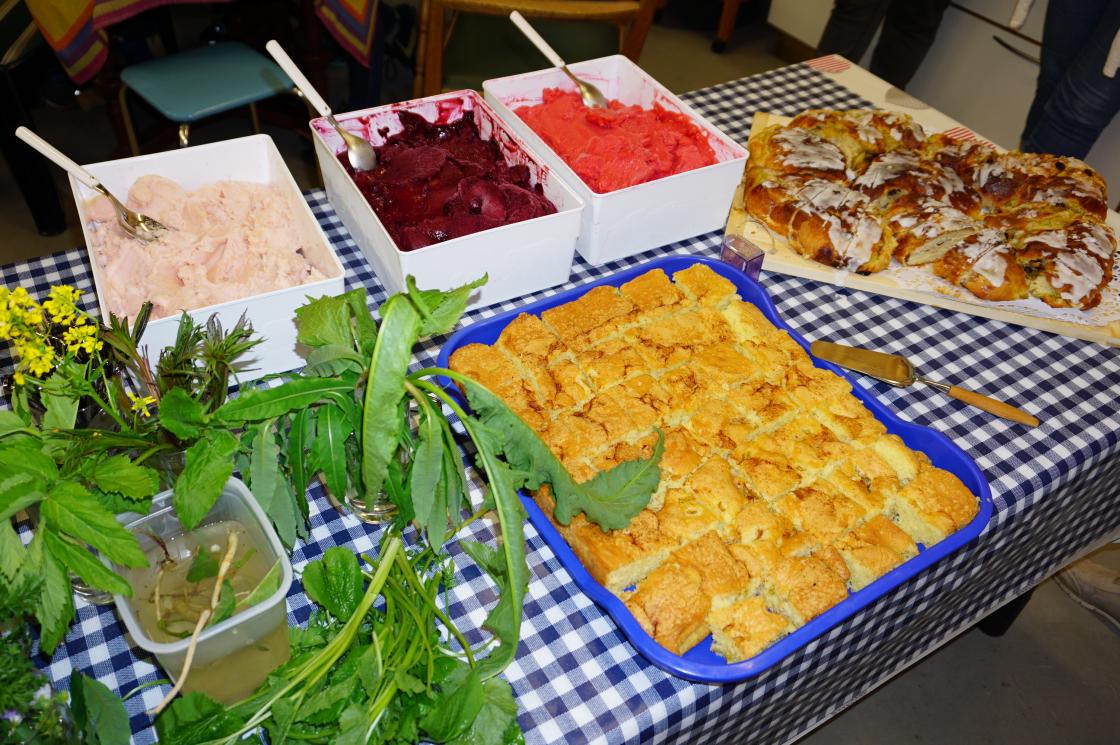 Ellen tok for seg bruk av urter og spiselige planter i nærområdet. Vi fikk servert nydelig neslesuppe med brød og kryddersmør. Dessuten var det smaksprøver på f.eks Løvenøtter – søte og herlige faktisk. Disse «nøttene» er de grønne løvetannblomstene før de har sprunget ut av bladene, stekt i olje og krydret. Kanskje synes du grøftekantsalat frister eller hva med ramsløkpesto og Geiterams asparges. Ikke å forglemme forvellet og smørstekt Strutsevinge-bregne! Helt utrolig gode smaker og ingrediensene finner du rett utafor stuedøra. Det kunne være lurt med ei bok som fortalte litt om hva som spisende og ikke, men alt hva vi fikk presentert denne kvelden var kjente planter med nye og uante bruksområder.