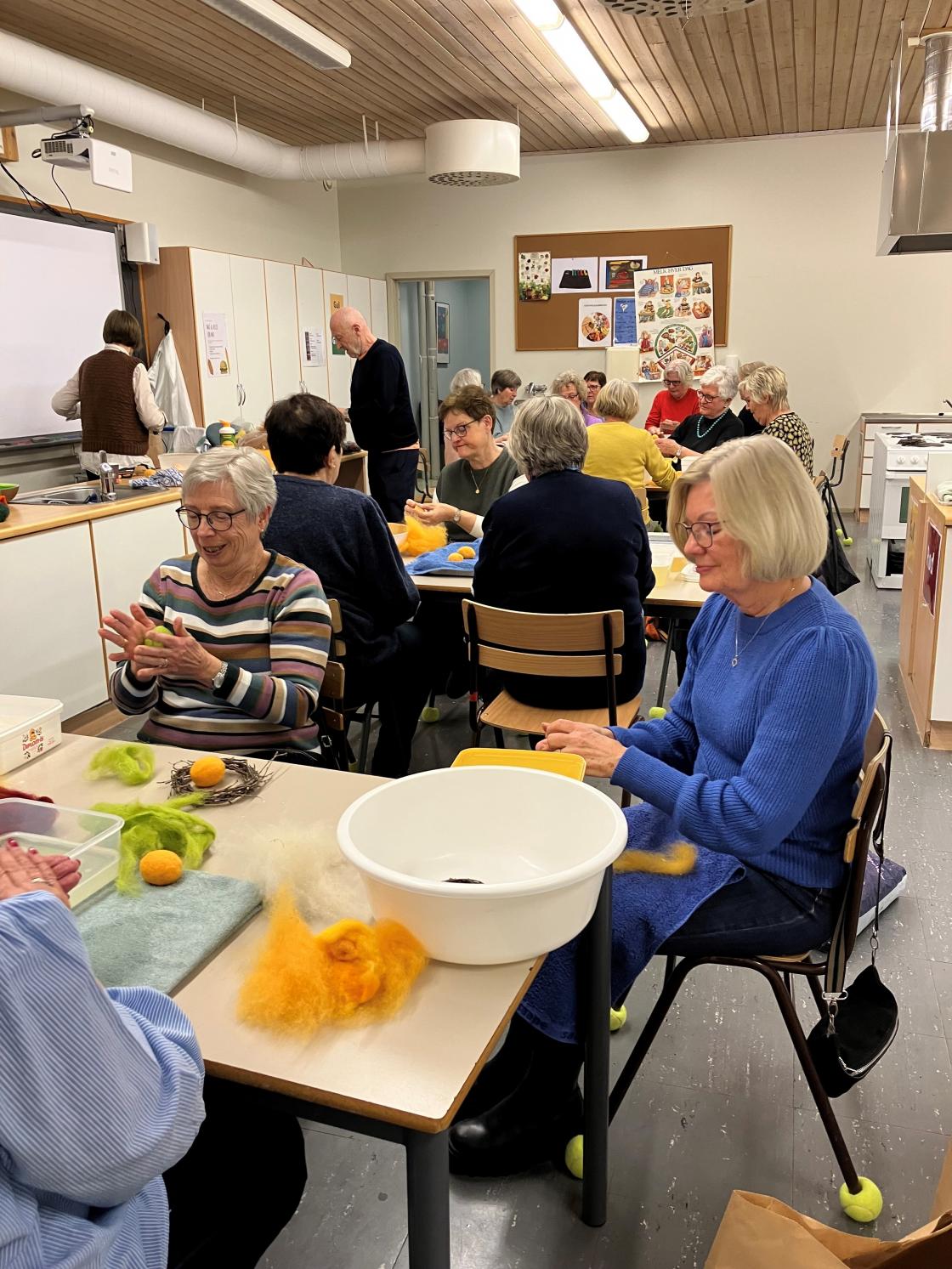 Stemningen var god og snart var alle i gang med tovinga. Det ble et flott utvalg av kyllinger og egg. Gro hadde i tillegg laget fuglereder av bjørk. Vi ble fornøyde med resultatene og hadde ikke minst en hyggelig kveld. Kaka til Karin smakte fantastisk!