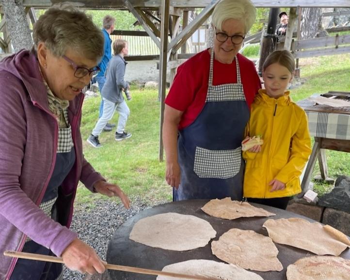 Litt lenger opp i bakken ble det bakt og stekt flatbrød på vedfyrt takke. Noen fikk prøve seg med kjevler, og alle som ville smake fikk flatbrød med smør. Tradisjonsmat.