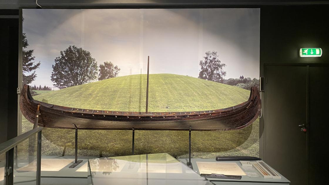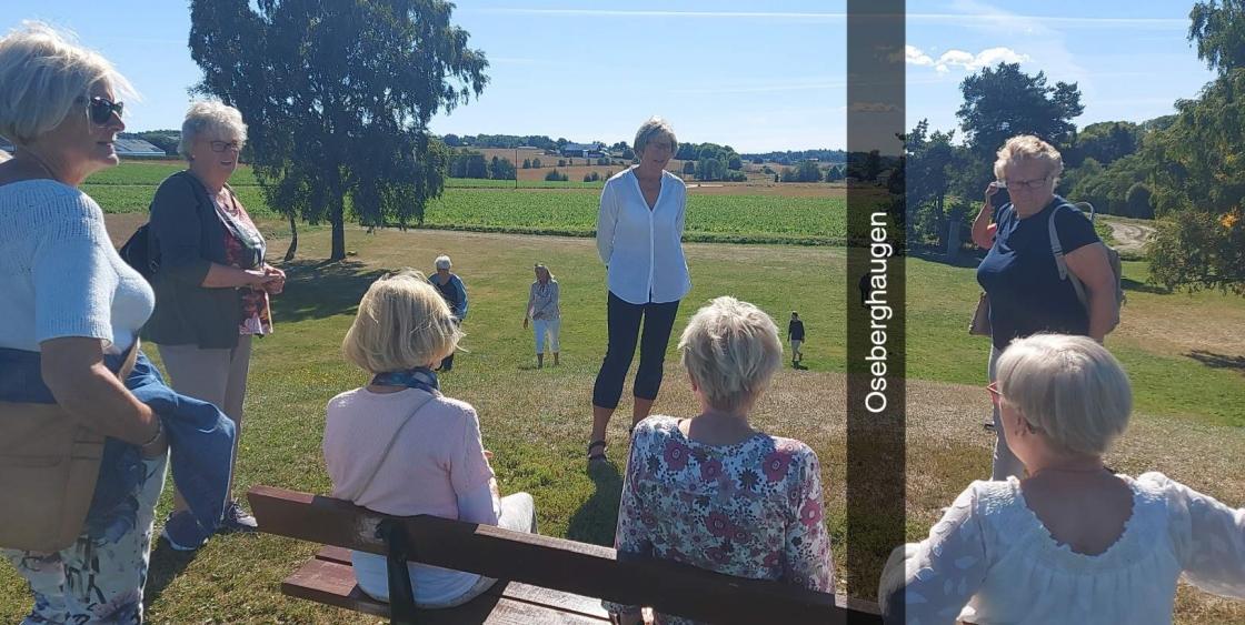 Fra Slottsfjellmuseet gikk turen videre til Oseberghaugen som ligger i Slagendalen et par kilometer øst for Tønsberg by. Oseberghaugen er et av verdens rikeste gravfunn fra vikingetiden. Her ble to kvinner gravlagt i skipsgrav sammen med treskjærerarbeid og store mengder dyr sommeren 834. Vestfold og Telemark fylkeskommune - Oseberghaugen (vtfk.no). Vi parkerte bilene og spaserte opp på gravhaugen og benyttet anledningen til å lese på informasjonstavlene og nyte utsikten.