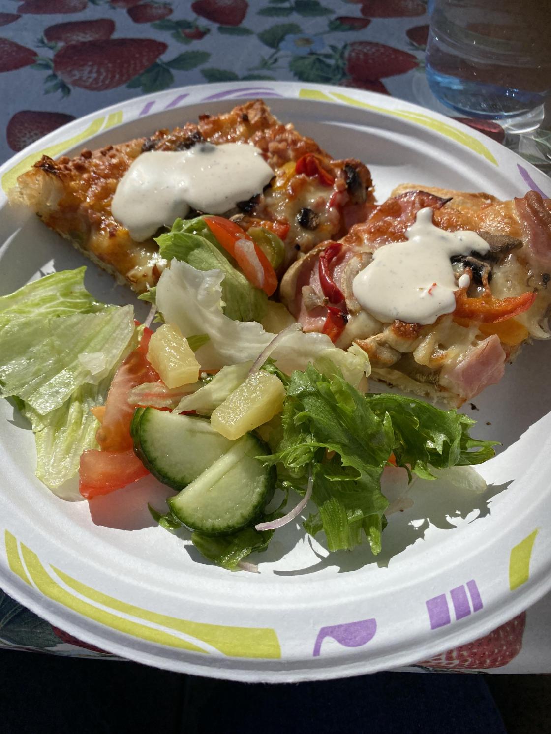 Etter en flott formiddag med kulturelt påfyll var tredje og siste stopp på turen hjemme hos turleder Kari Myhr på Ringshaug. Her ble det servert pizza og mineralvann til sultne kropper. Sommeren var absolutt ikke over og noen av damene benyttet anledningen til et deilig sjøbad på Ringshaug strand. Etter badetur smakte det med nydelige kaker og kaffe før turen gikk hjem til Sandsvær.