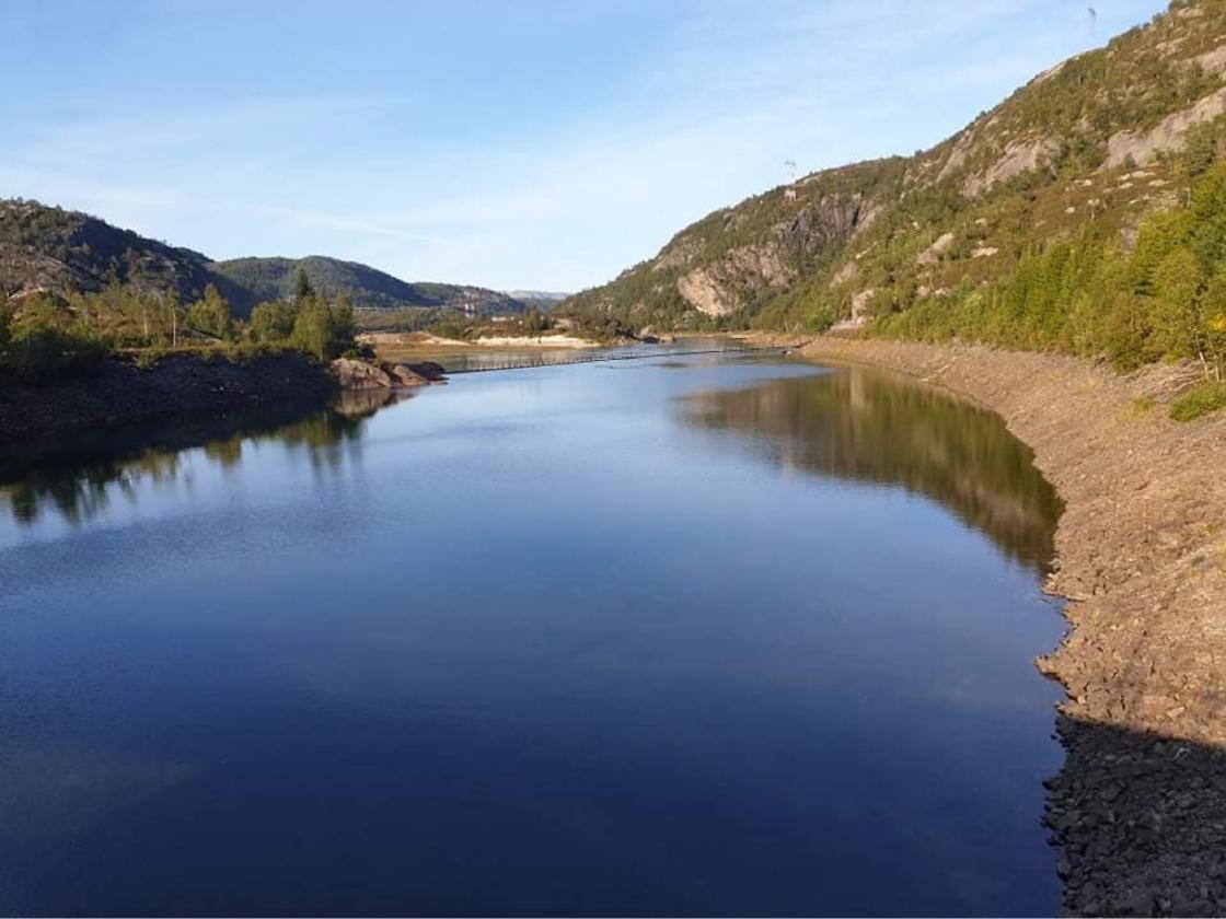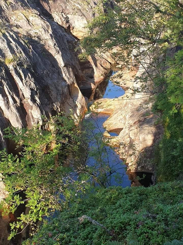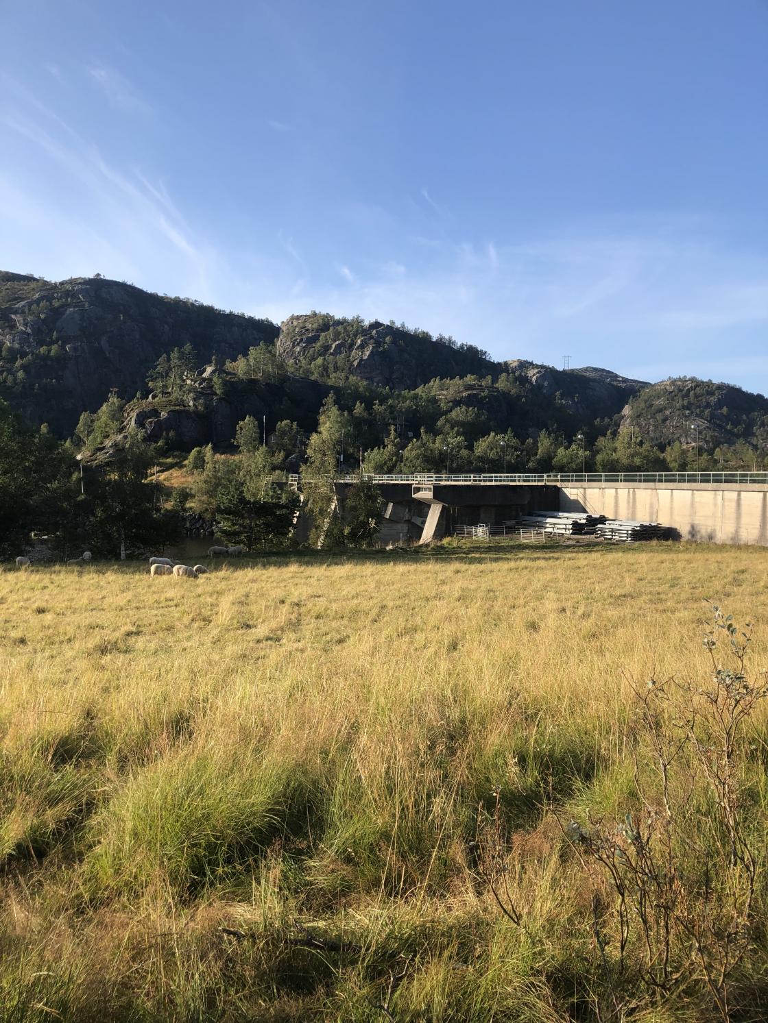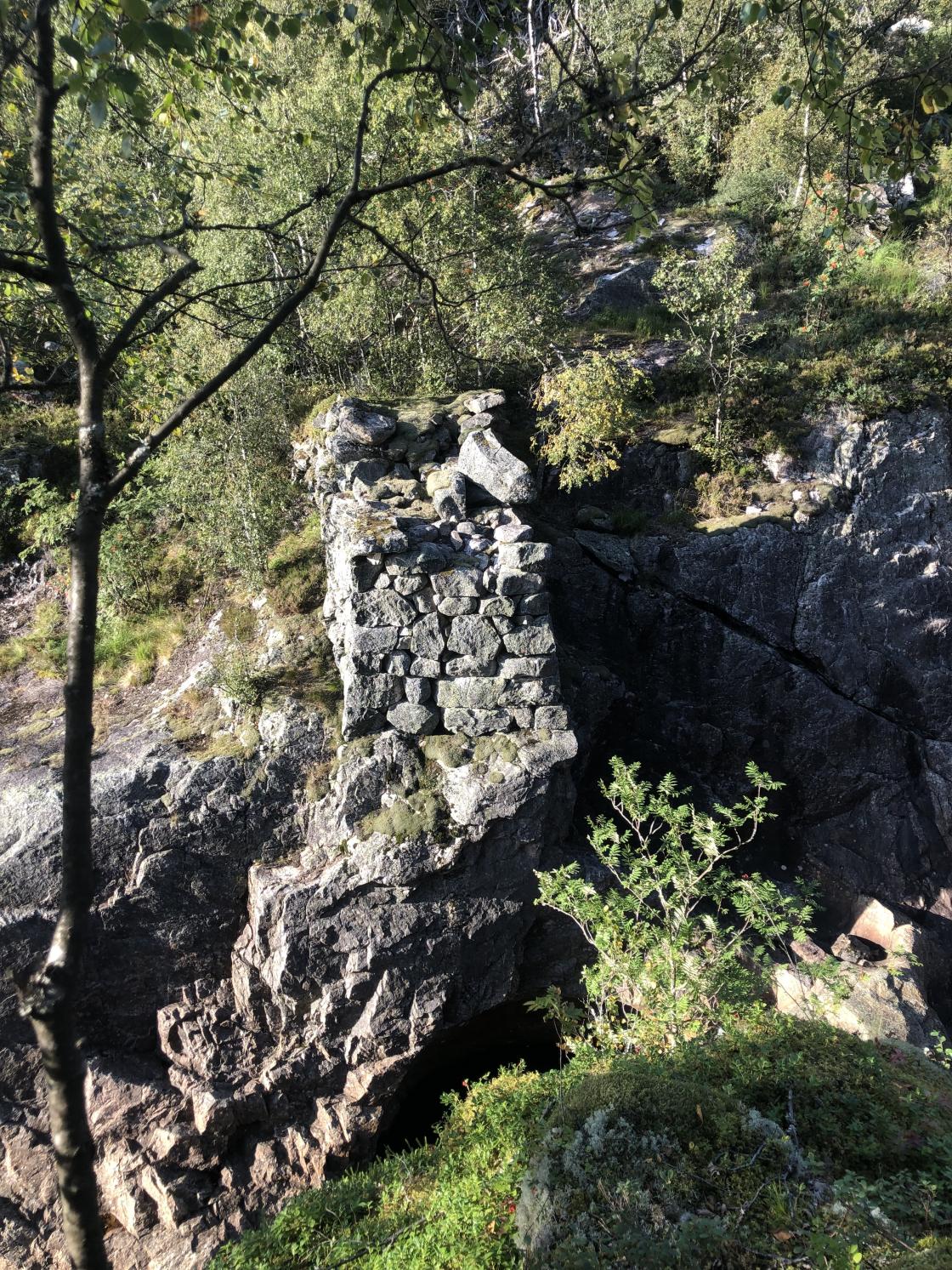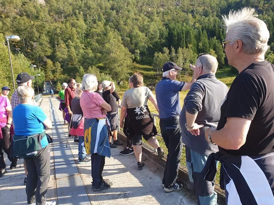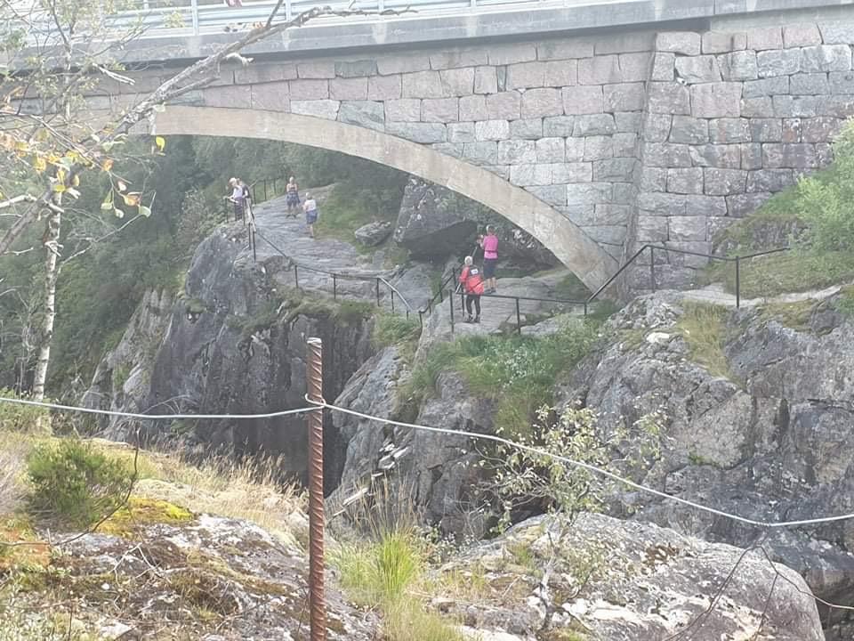 Turid Omlid Fjeldsaa guida oss frå parkeringa ved Dorgefoss langs den gamle vegen nordover fordi dei gamle brukara og jettegrytene til dammen på Handeland.