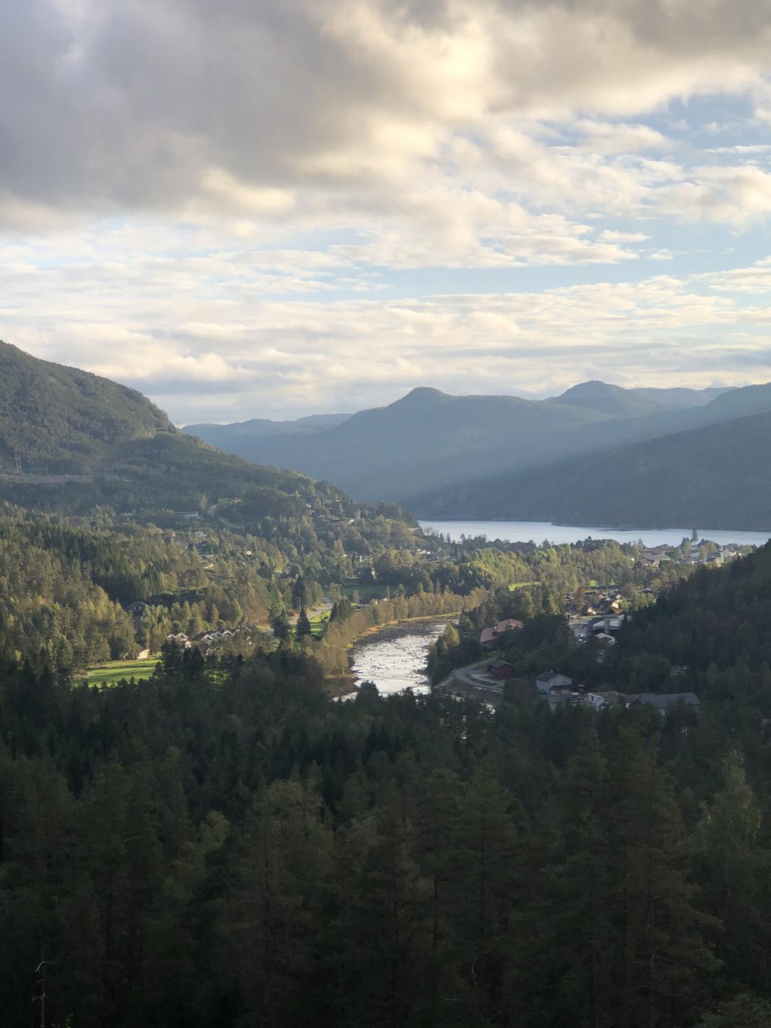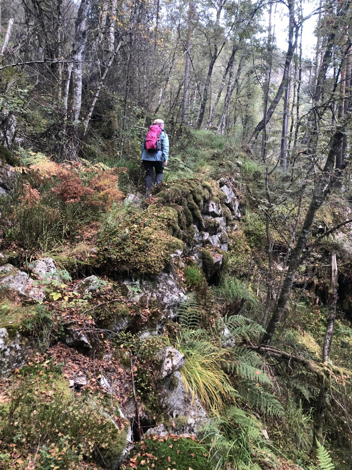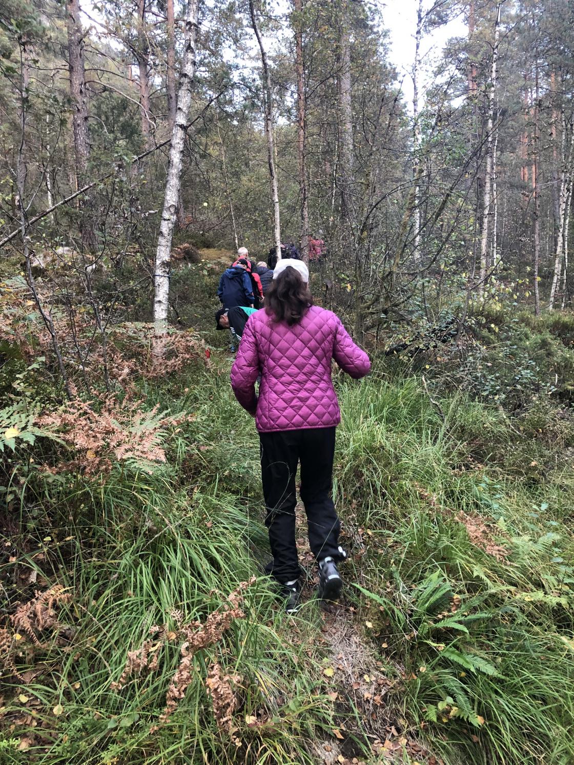 At løypa innimellom høge, mørke grantre skulle vera lett, er ei overdriving. Det gjekk jamt bratt oppover, og me måtte sjå oss godt for i det lange graset så me ikkje snofla i steinar eller røter som låg rett over vegen! Det blei lang, lang rekke etter kjentkvinne Kathrine Berge Seland. Og tung pust for nokre av oss... Litt blåbær kunne me kosa oss med medan me tok ein pust i bakken, for lite visste me at det vart kaffi og kaker på toppen.