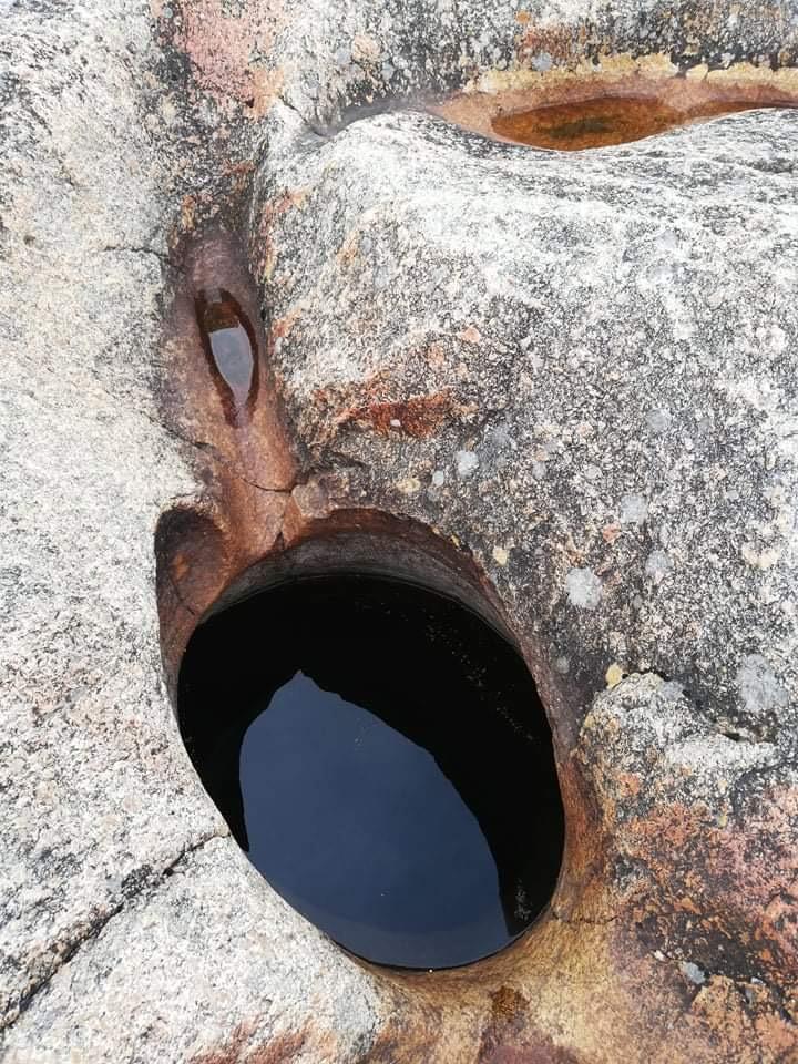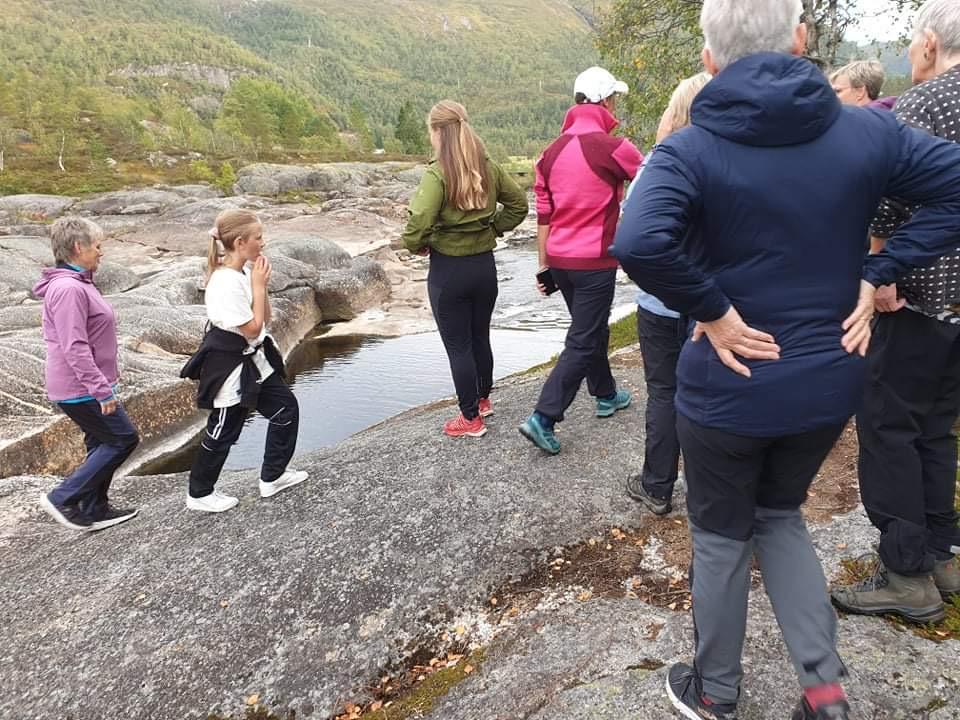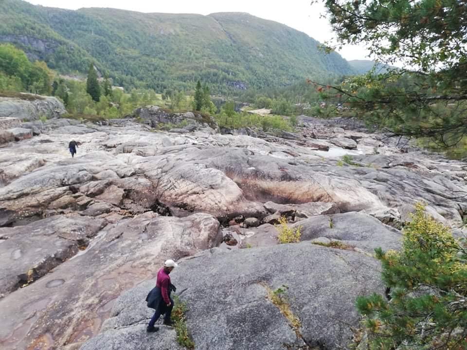 Nokre klatra ned til Nesefossen sjølv om det var nokre bratte parti, og såg på jettegrytene. Vasstanden var enormt låg, så me såg bare små bekkar mellom steinane. Helin fortalde at det er ein veldig populær plass å bada både for lokalbefolking og hyttefolk om sommaren. Oppover fossen måtte dei i gamle dagar sprenga litt fjell for å få vasstanden ned, og det var alltid mykje flaum. Frå Neset rodde dei med båt over til Sinnes.