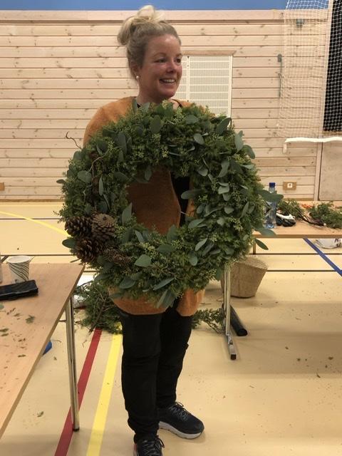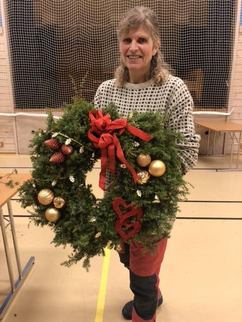 Bygdekvinnelaget stilte med krans og vikletråd, medan kvar enkelt hadde med det dei sjølv ynskte å bruks. Nokre valde ein krans som kan pynta opp lenge uansett høgtid, andre satsa på adventsfargar, medan mange laga julekrans. Variasjonen og kreativiteten var stor, som du ser, medan ei dame ville gjera seg ferdig heime.