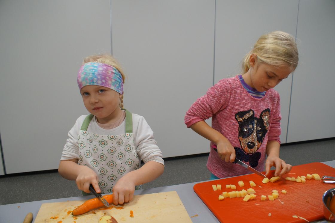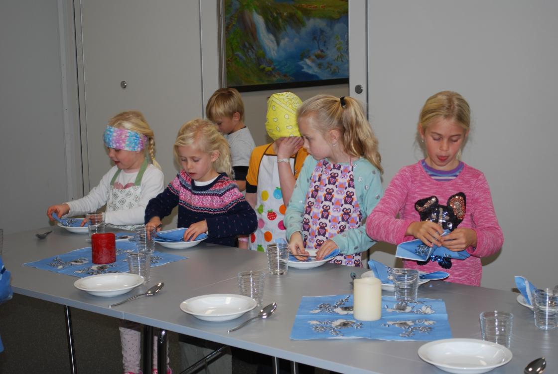 I dag har vi lært 1. og 2.klasse og laga betasuppe heilt fra bunnen. De skrelte og kutta opp gulrøtter, kålrot, poteter, purreløk, og pølser. Tilslutt hadde de i årets gryn,bygggryn og buljong til kraft. De var virkelig ivrige i jobben.Etter det dekka de sjøl bordet med fat og og glass og pynta med servietter. Deilig suppa blei det som og lærarane og rektor fikk servert. Ein fin dag for oss bygdekvinner som fikk væra med klassane.