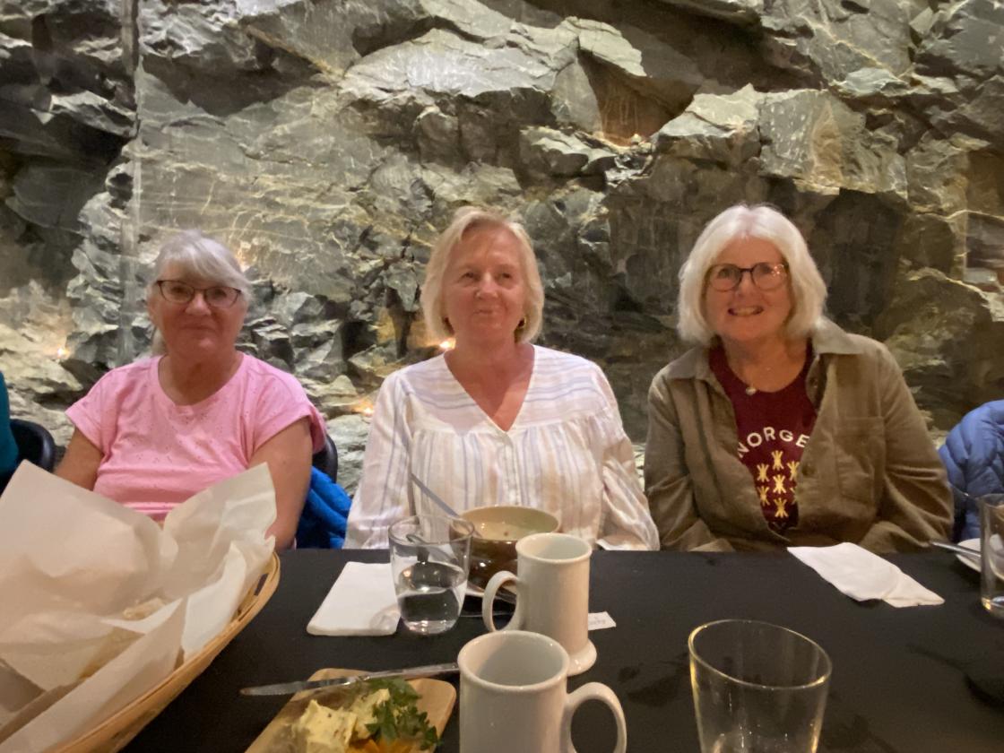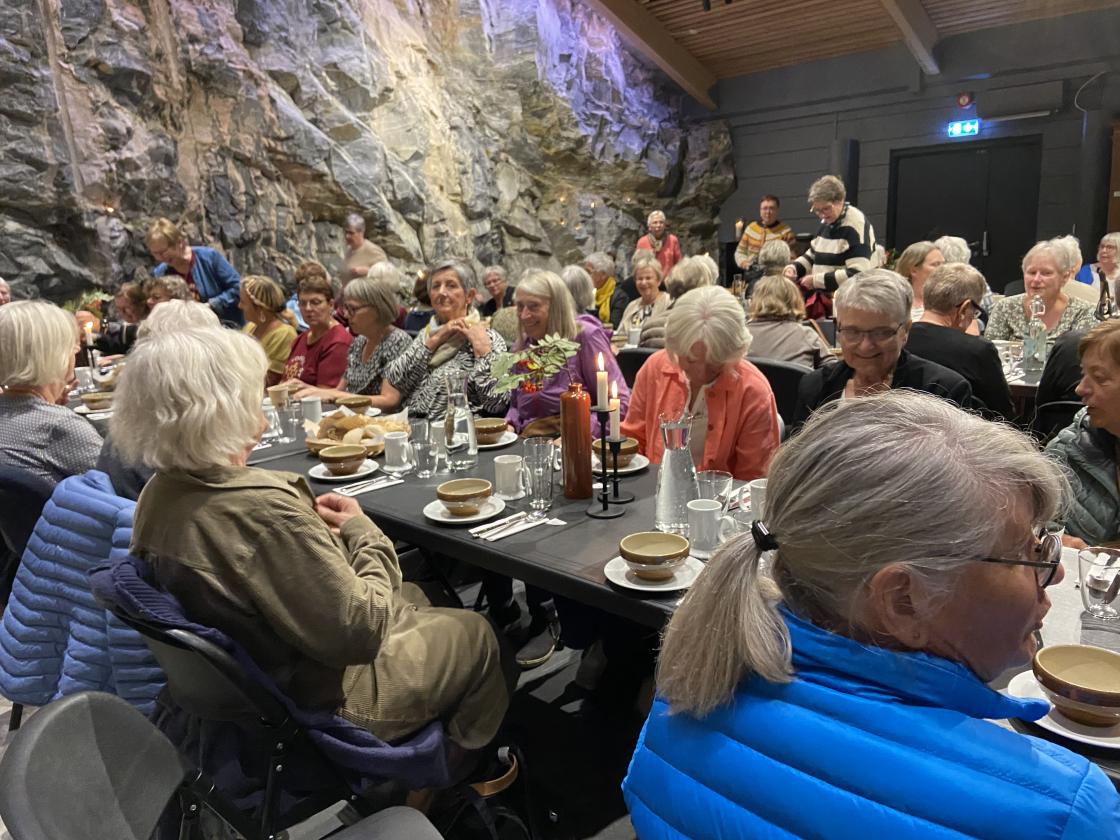 Vi ble servert deilig lunsj: Tora Mostrasong si kjærlighetssuppe. Etter lunsj fortalte Johanne Ø, Tvedten om "Sterke armer - varme hender". Fortellinger om kystkvinnene. Kaffi og kake ble servert, samt loddsalg.