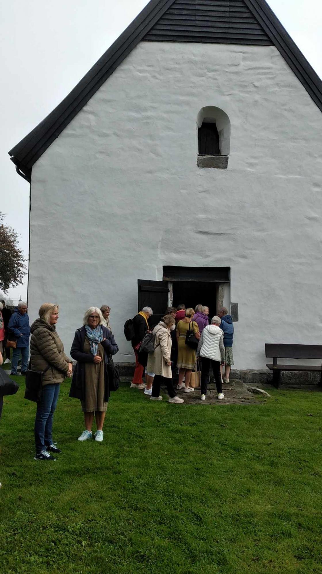 Det var oppmøte ved Moster gamle Kyrkje, der guide tok imot oss. Vi fikk omvisning i kirka som er ei steinkirke fra 1100-tallet og en av landets eldste kirker.