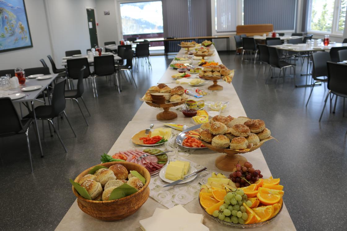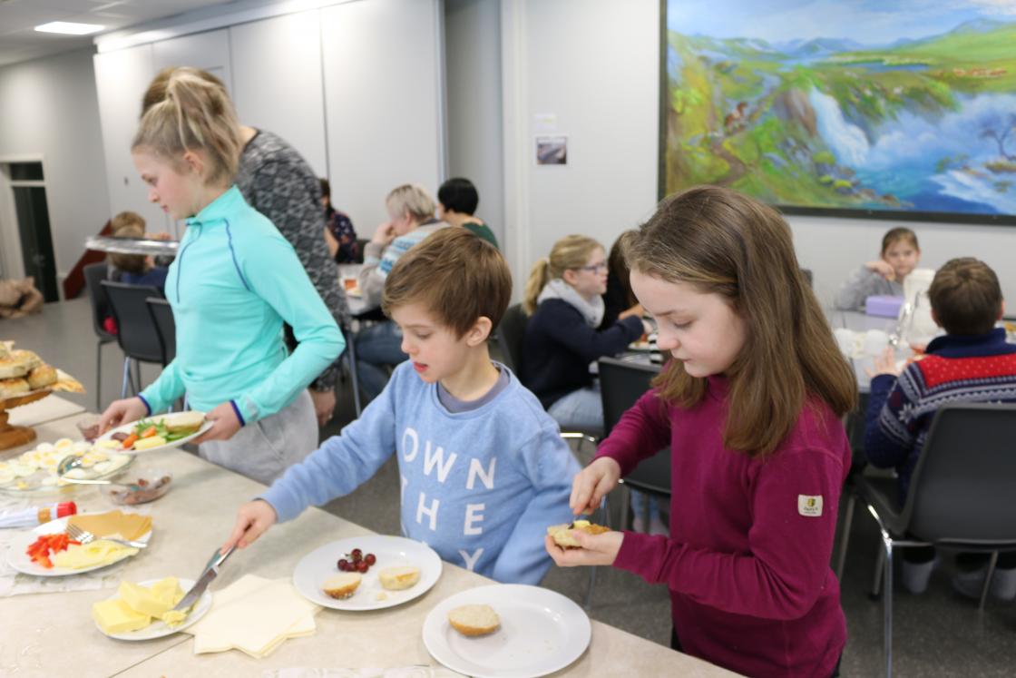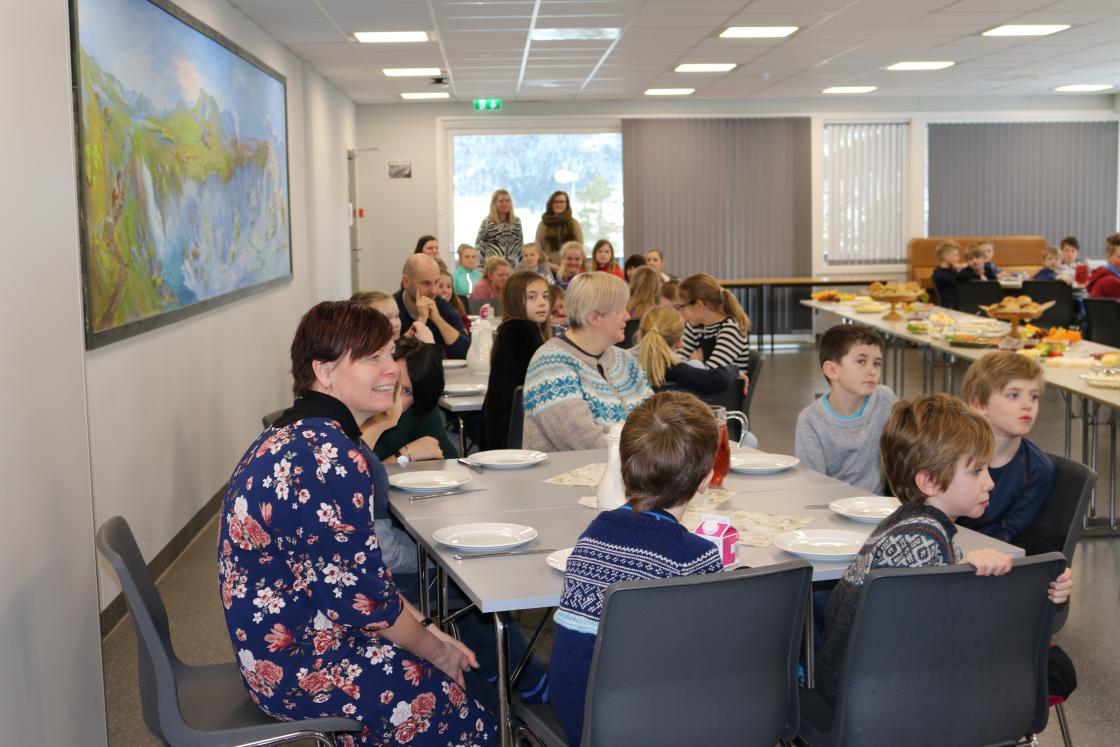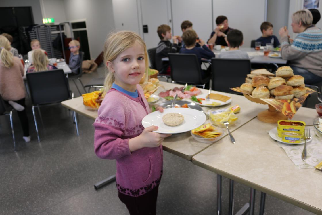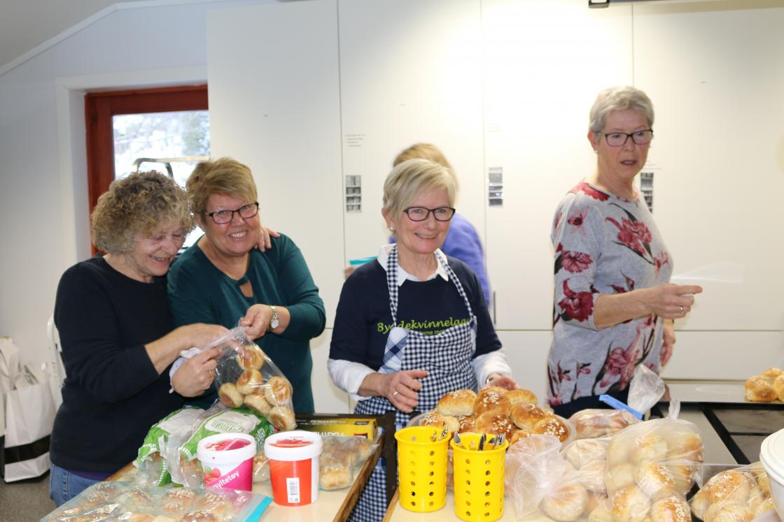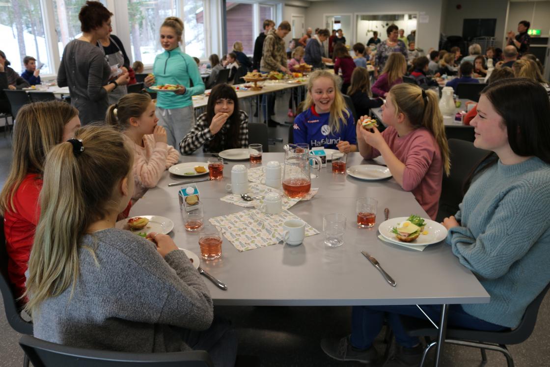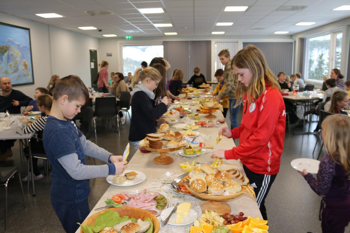 Det vart handla inn mat,frukt og pålegg i store mengder. Havrebollar vart bakte og vi damene møtte opp klokka ni. - klare til dyst. Vi veit at skuleungane (og lærarane) ser fram til dette kvart år. 20 damer møtte fram og straks over klokka elleve toga skuleungane inn i matsalen. I alt 57 elevar og 10 lærarar (ikkje alle var til stades denne dagen)