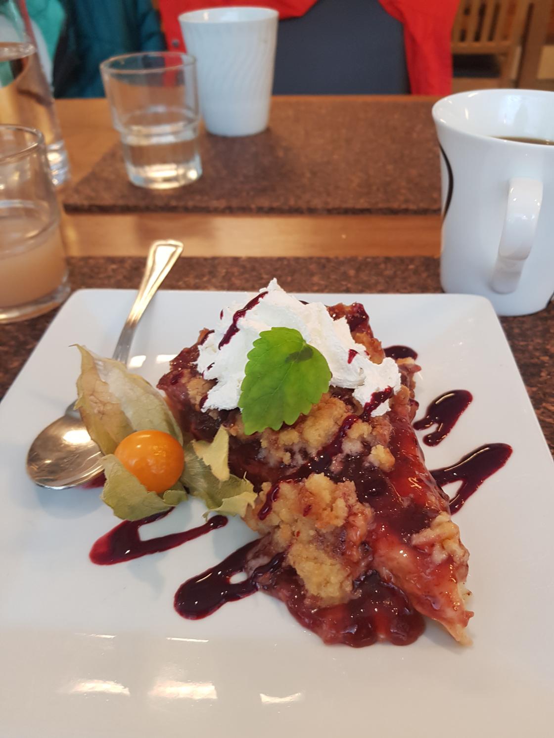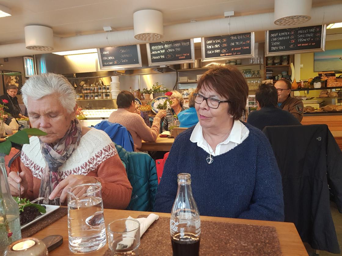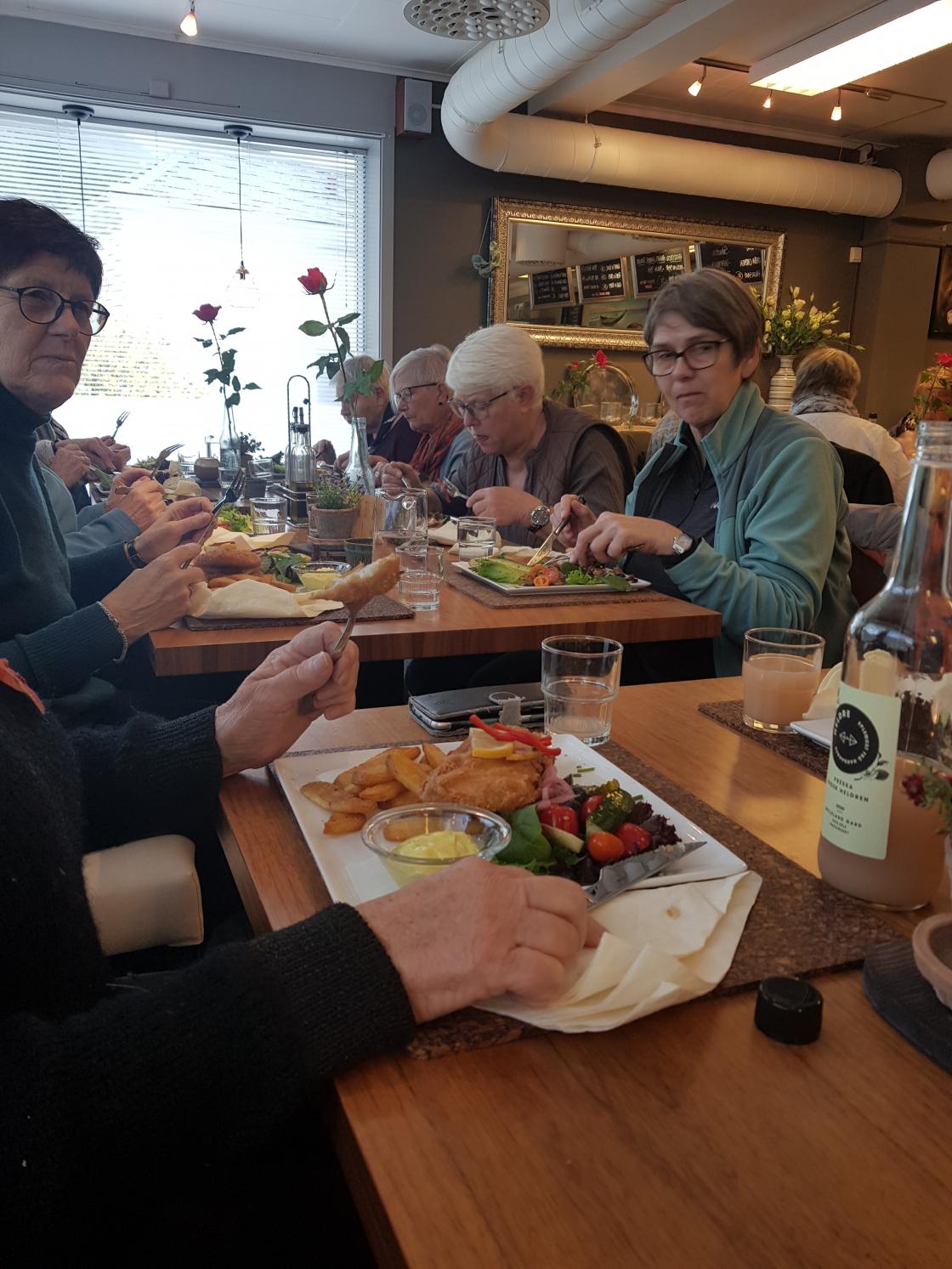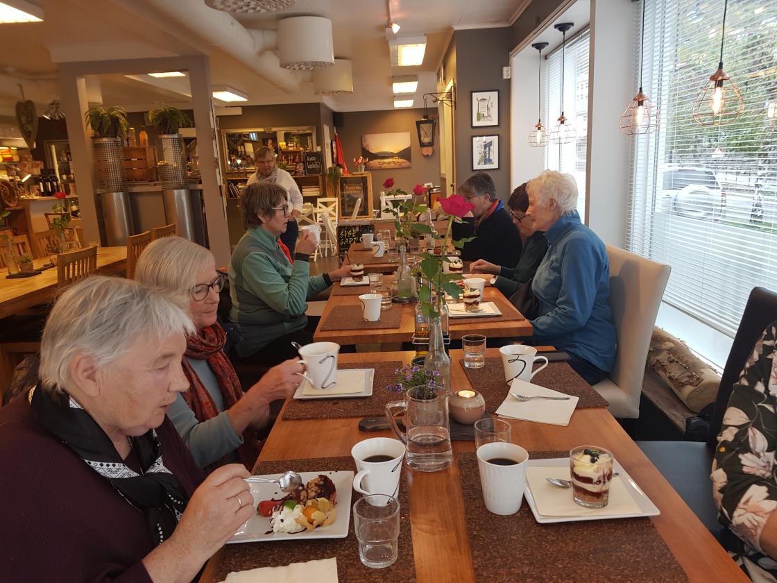 På førehand hadde vi tinga plass på Kompaen på Lofthus for ein sein lunsj (kl 14.00). Maten fall i smak, og kake/dessert til kaffien var avslutninga på eit godt måltid. Her hadde vi og høve til å handla diverse ostar og kjeks/bruchetta, så eg trur vertskapet var særs nøgd med besøket vårt.