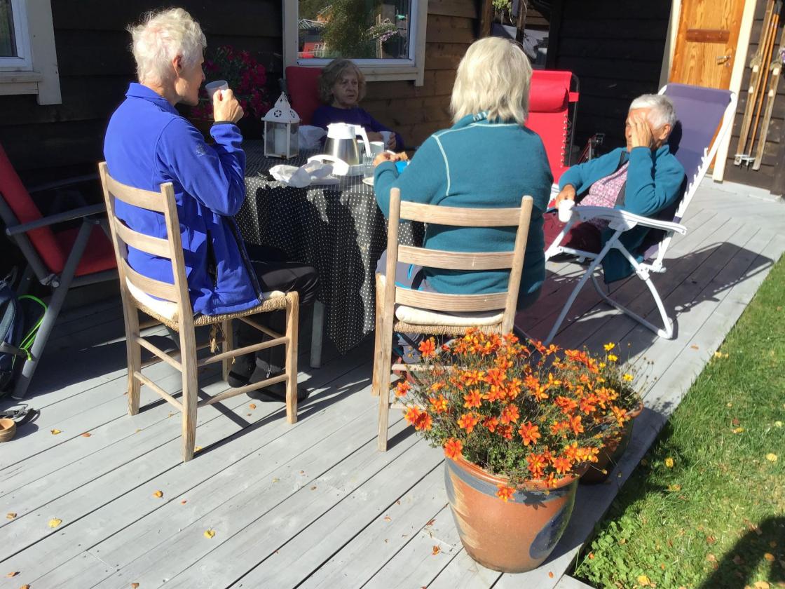 Då vi var kommet rundt vatnet, var vi oppe hos Ingunn Løyning, medlem og guide for turen vår. Her fekk me kaffe.